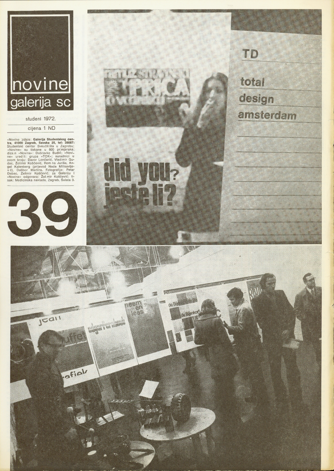 price 1 ND; publisher: Student Centre Gallery, Zagreb, Savska 25, University Student Centre in Zagreb; newspaper design Dubravko Budić; editor: grupa TOK; photography: P. Dabac, Ž. Koščević; 600 copies printed; press: Medicinska naklada, Zagreb, Šalata 3; for the newspaper and gallery: Želimir Koščević; collaborators: Davor Lončarić, Vladimir Gudac, Želimir Koščević, Romina Juriša, Angel Kalenberg (translated by Nada Milisavljević), Dalibor Martinis; Aleksandar Srnec, Niki de Saint-Phalle, Slobodan Dimitrijević, Joseph Beuys, Total Design
