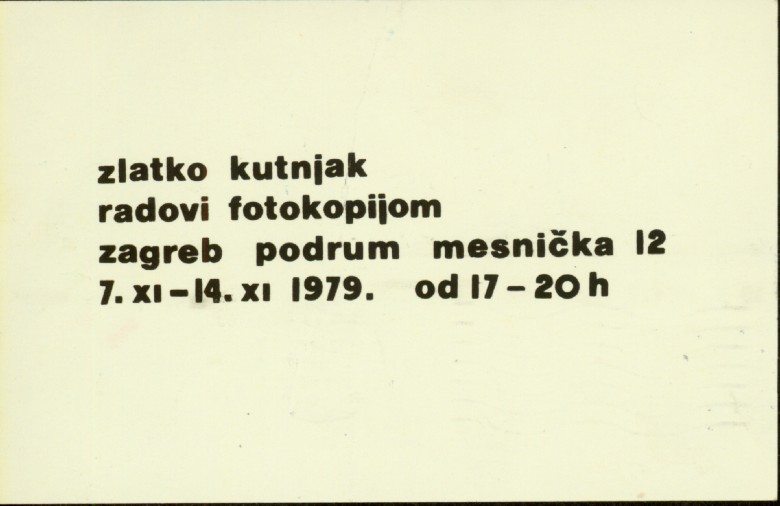 invitation for the exhibition of Zlatko Kutnjak "Radovi fotokopijom" at Podroom, Mesnička 12, Zagreb
