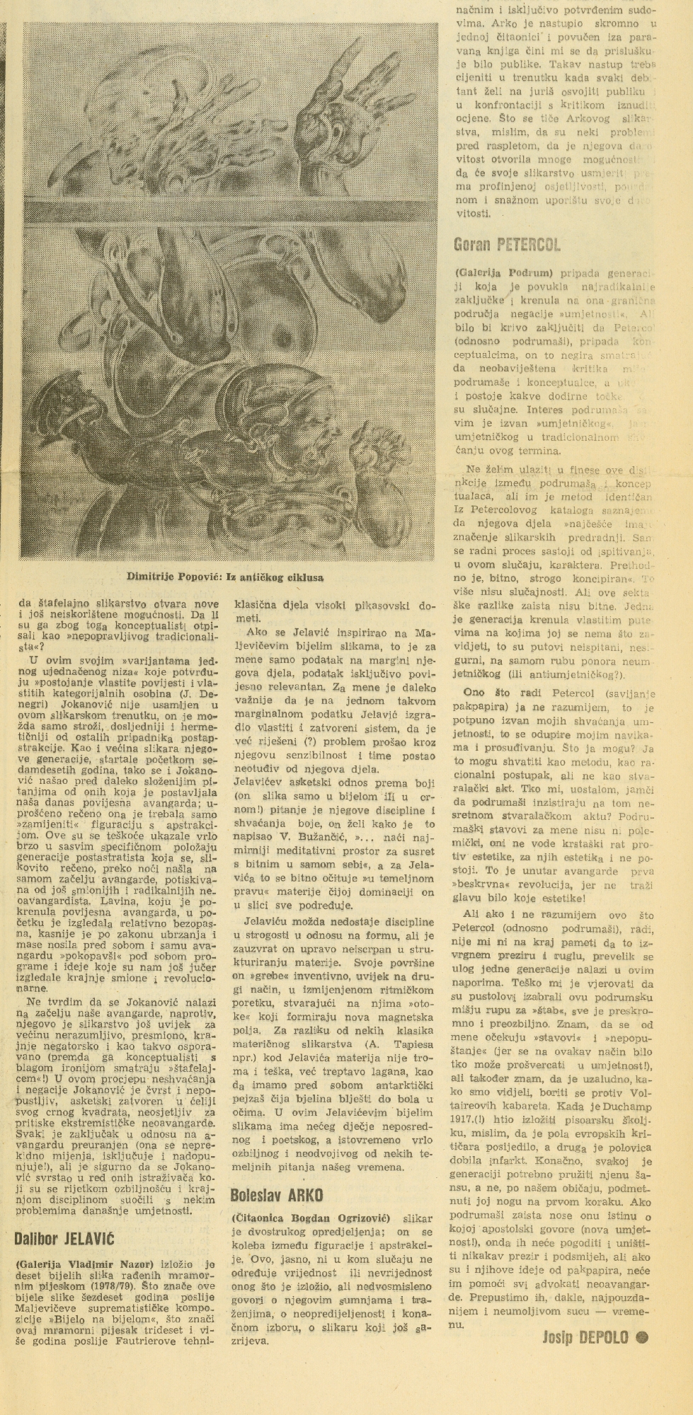 a part of the article "Naglasak na avangardi" by Josip Depolo about Goran Petercol in newspaper "Oko" , 19 April - 3 May, 1979, page 19