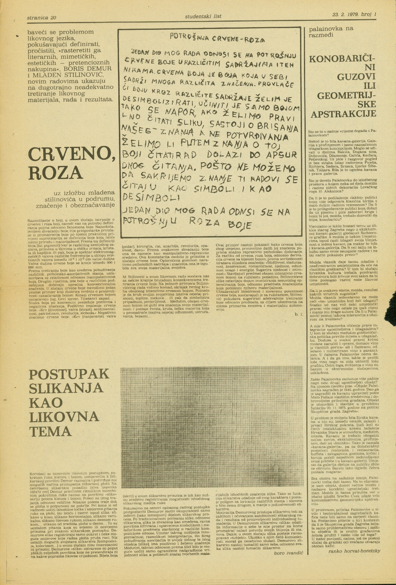 article in Studentski list no.1 by Boro Ivandić, page 20; Boris Demur, Mladen Stilinović