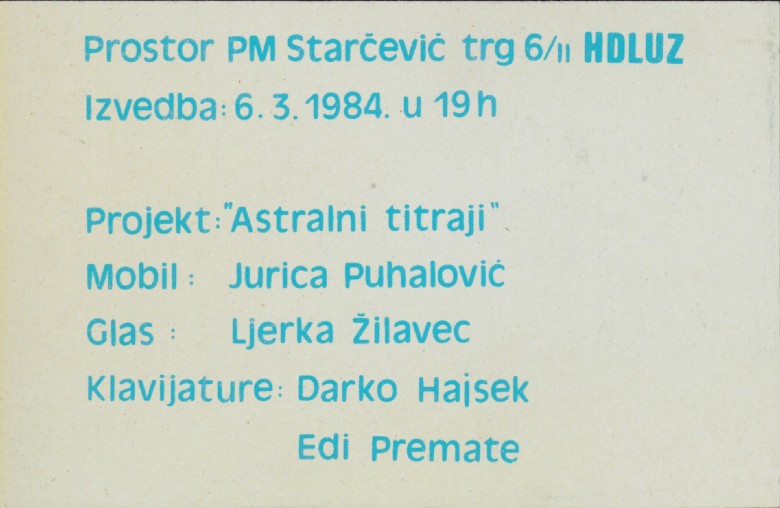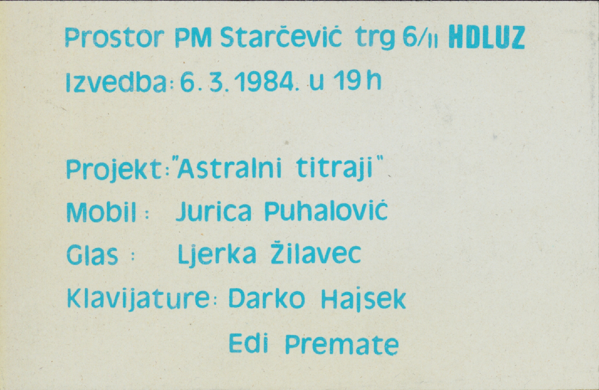 invitation card for the musical performance "Astralni titraji" by Jurica Puhalović, Ljerka Žilavec, Darko Hajsek, Edi Premate