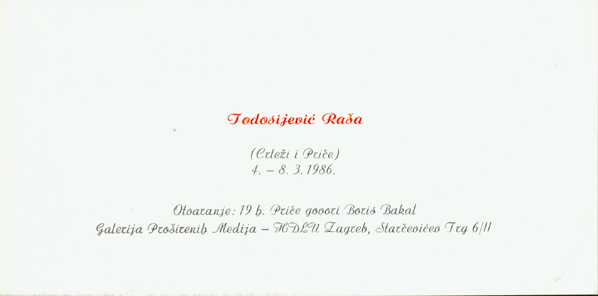 invitation card for the exhibition "Crteži i priče" of Raša Todosijević in PM