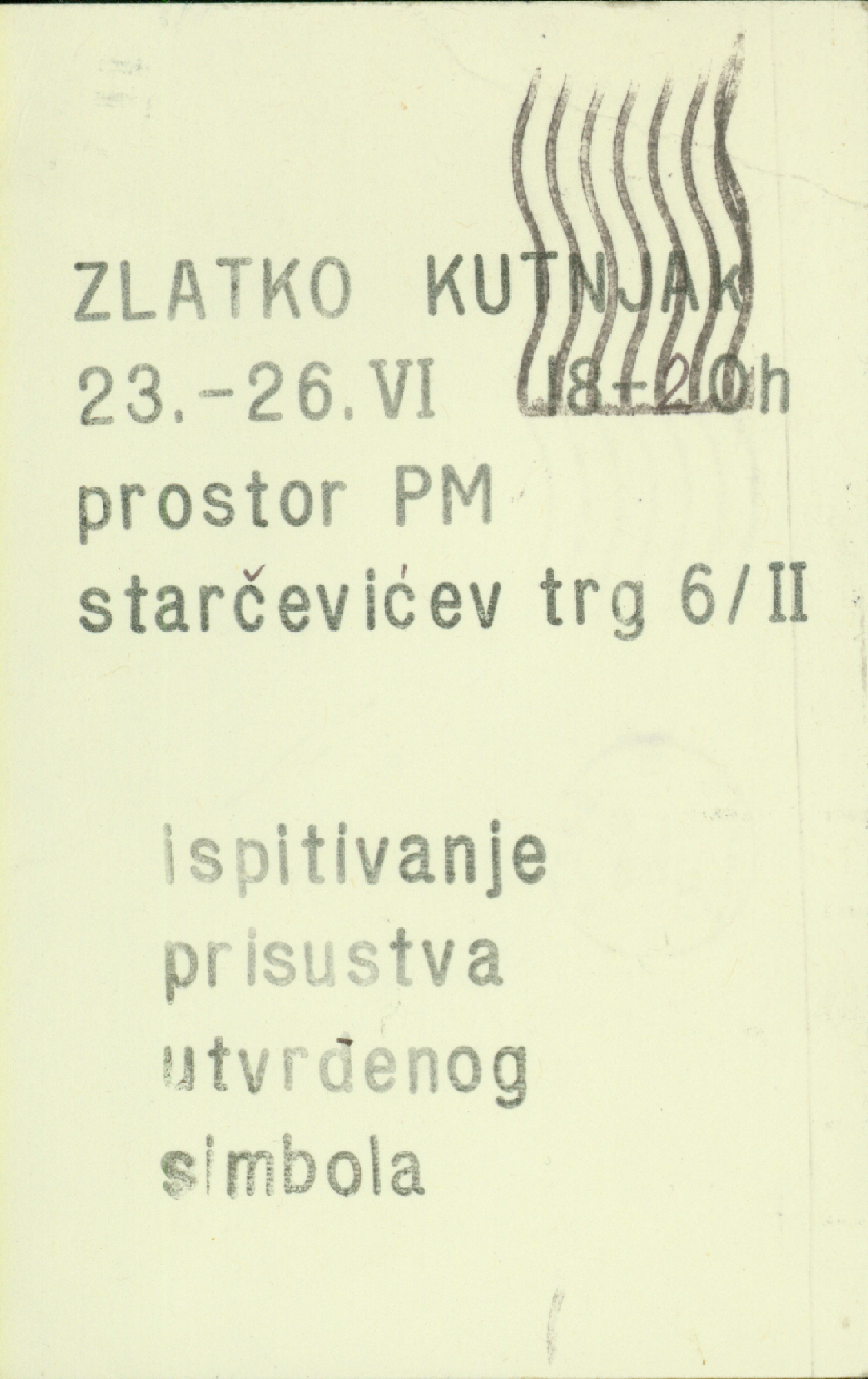 invitation for the exhibition "Ispitivanje prisustva utvrđenog simbola" by Zlatko Kutnjak in PM
