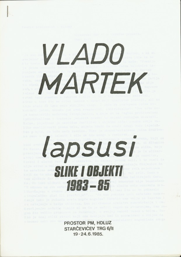 catalogue of the exhibition "lapsusi - Slike i objekti 1983-85" of Vlado Martek in PM; text "Pesnik, predpesnik i slikar" by Mića Bašičević