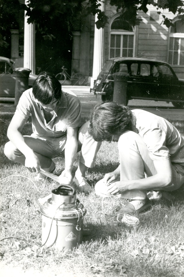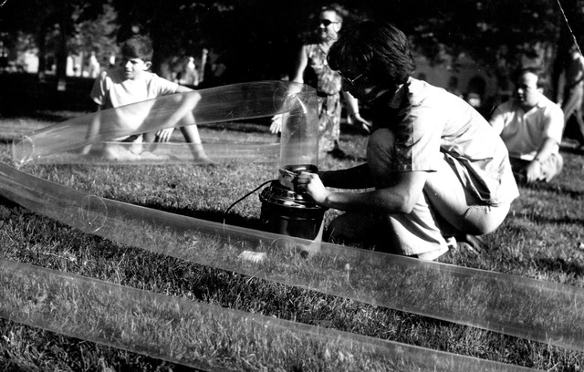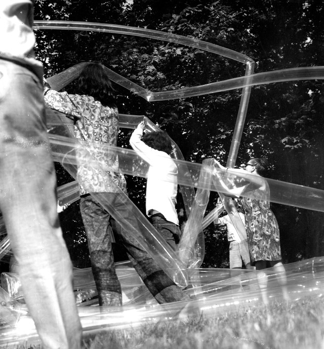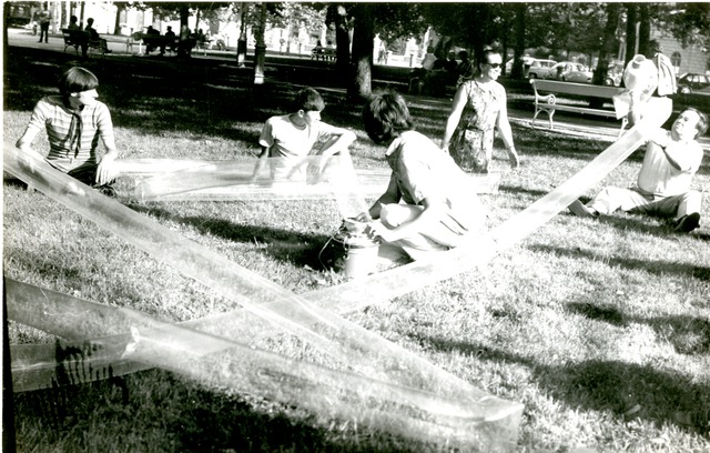 napihovanje plastične cevi s sesalcem in igranje publike v parku Zvezda v Ljubljani, poleti leta 1968. v zg hepening je avtor NEZ - TRIBUNA, 29.4 68, XVI, št. 19