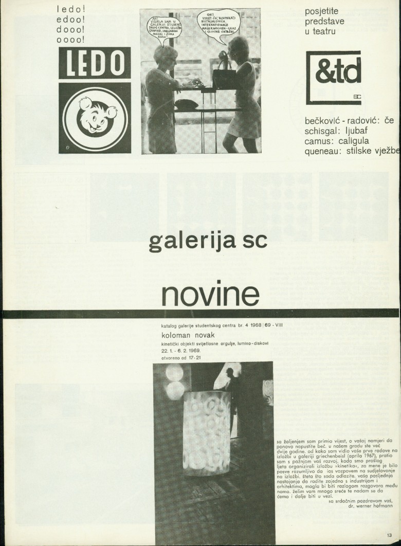 Studentski centar Sveučilišta u Zagrebu, Galerija Studentskog centra, Zagreb, Savska 25; Plakat i katalog B. Bućan, fotografije G. Hofman, M. Braut, V. Jakolić; tisak i sitoštampa grafičko likovni servis SC; katalog štampan u 500 primjeraka; Želimir Koščević, Daniela Pallazzolli, Maks Bill, Koloman Novak, dr. Werner Hofmann
