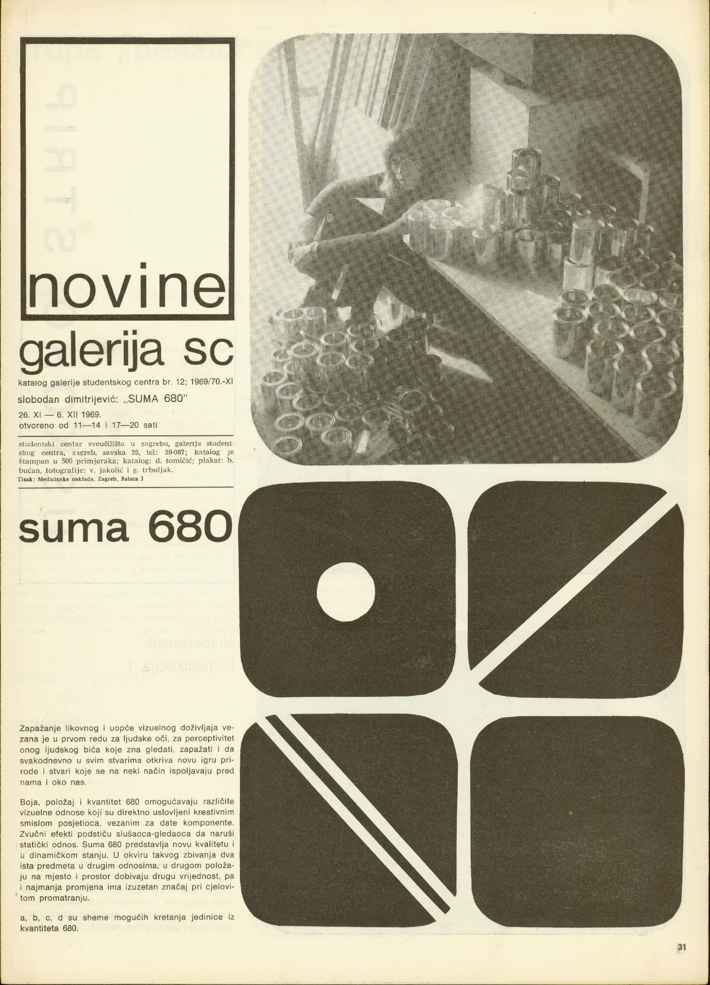 Studenstki centar Sveučilišta u Zagrebu, Galerija Studentskog centra, Zagreb, Savska 25; Plakat B. Bućan, Katalog D. Tomičić; fotografije V. Jakolić, G. trbuljak; katalog štampan u 500 primjeraka; tisak: Medicinska naklada, Zagreb, Šalata 3; Slobodan Dimitrijević, Goran Trbuljak
