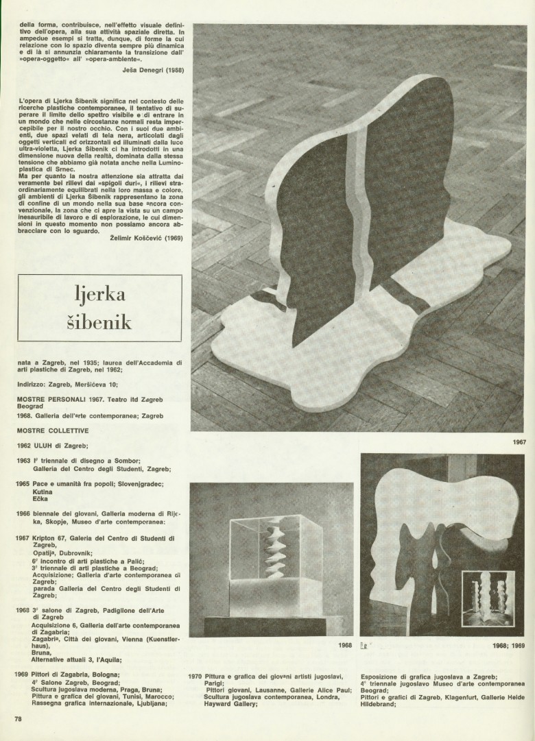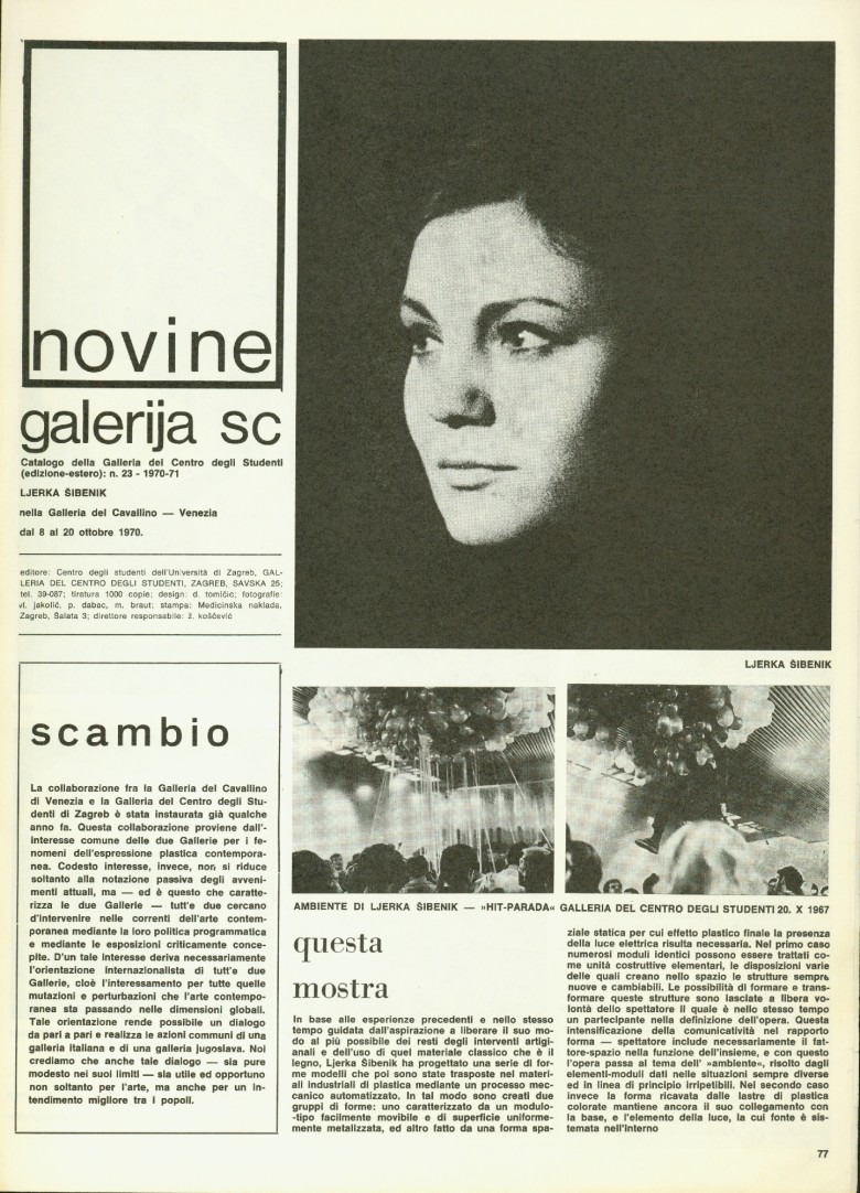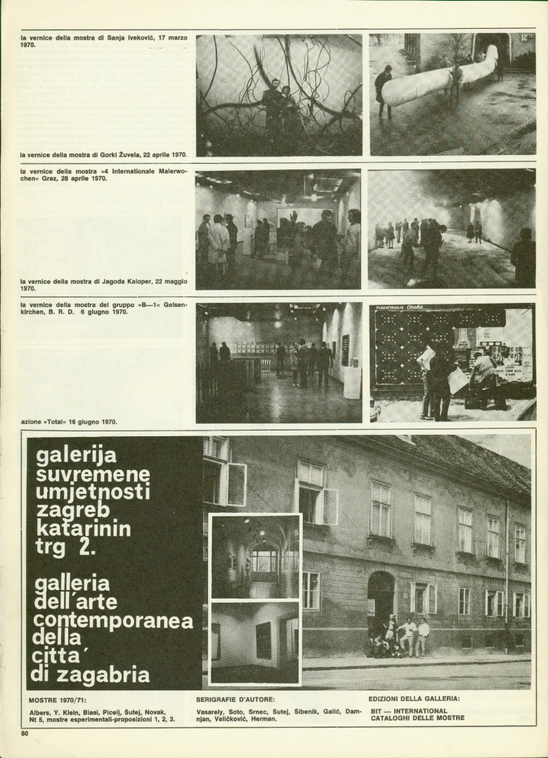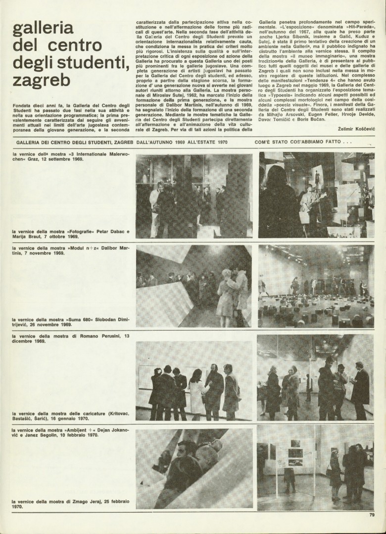 Izdanje na talijanskom jeziku; Studenstki centar Sveučilišta u Zagrebu, Galerija Studentskog centra, Zagreb, Savska 25; novine D. Tomičić, fotografije Vl. Jakolić, P. Dabac, M. Braut; katalog-novine štampan u 1000 primjeraka; tisak: Medicinska naklada, Zagreb, Šalata 3; za galeriju i katalog: Želimir Koščević; Ljerka Šibenik, Ješa Denegri, Želimir Koščević, Petar Dabac, Marija Braut, Slobodan Dimitrijević, Dalibor Martinis, Redor Kritovac, Zlatko Bastašić, Ivo Šarić, Dejan Jokanović, Janez Segolin, Zmago Jeraj, Sanja Iveković, Gorki Žuvela, Romano Perusini, Jagoda Kaloper, grupa "B-1"