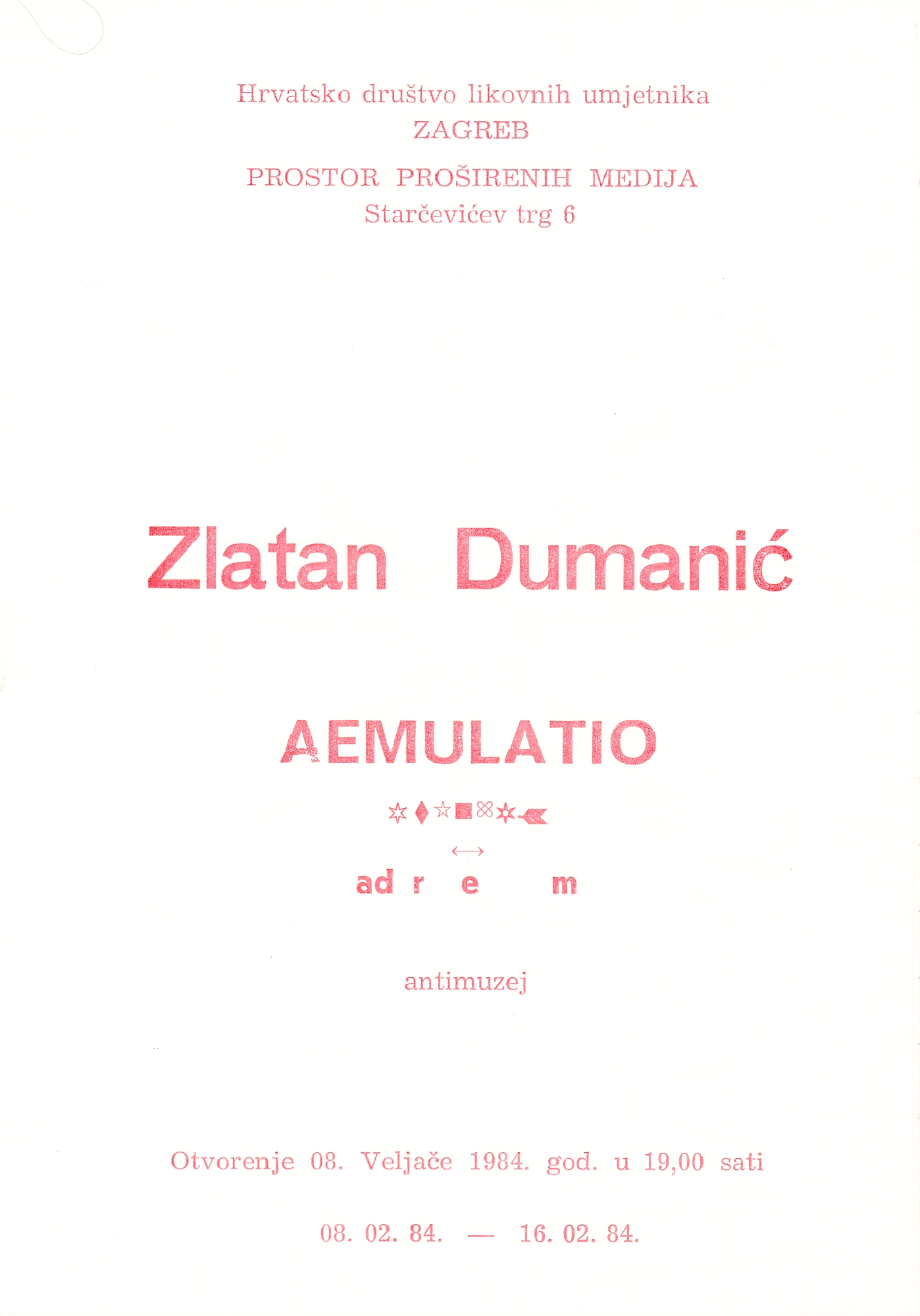 pozivnica za izložbu "Aemulatio" Zlatana Dumanića u Galeriji Proširenih medija