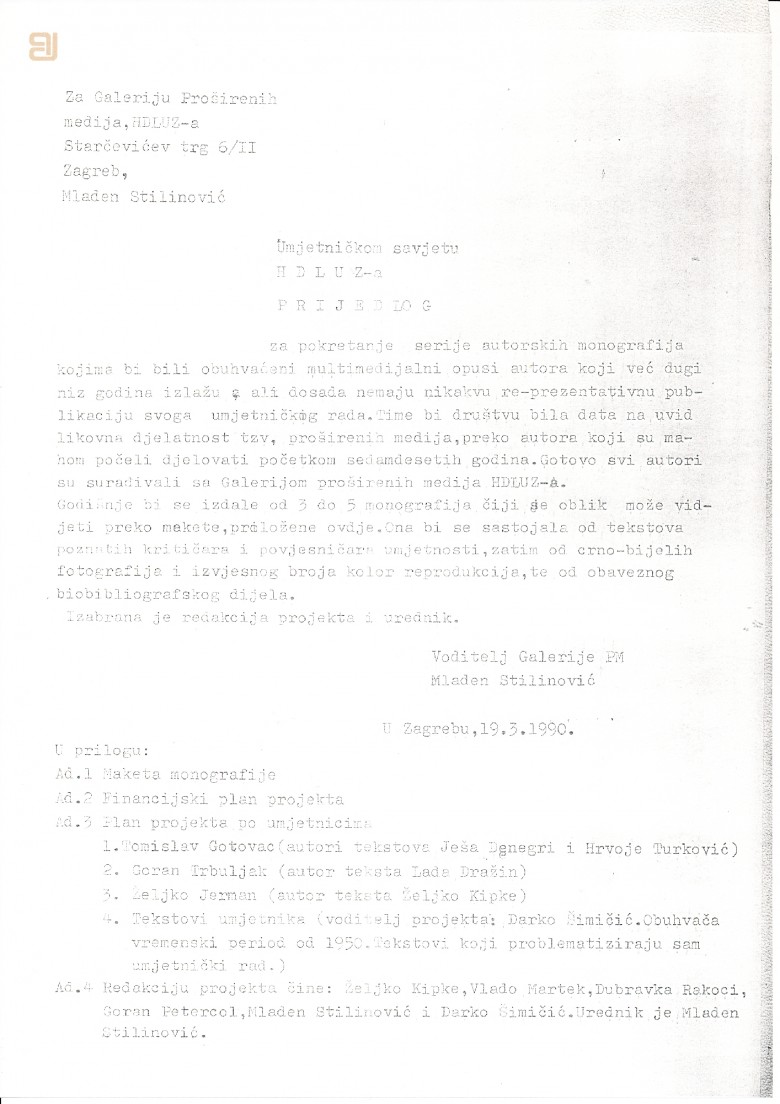 prijedlog za pokretanje serija autorskih monografija upućen Umjetničkom savjetu HDLUZ-a