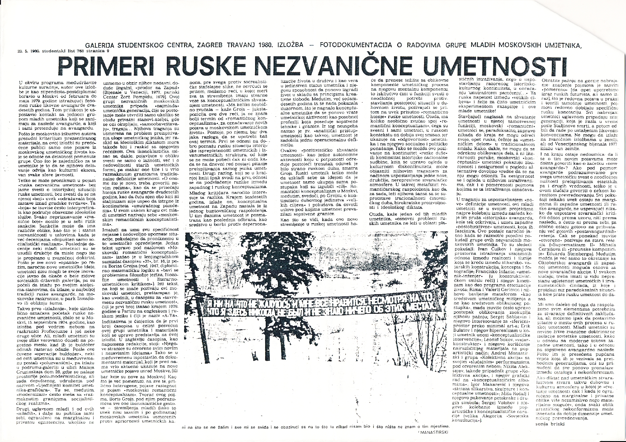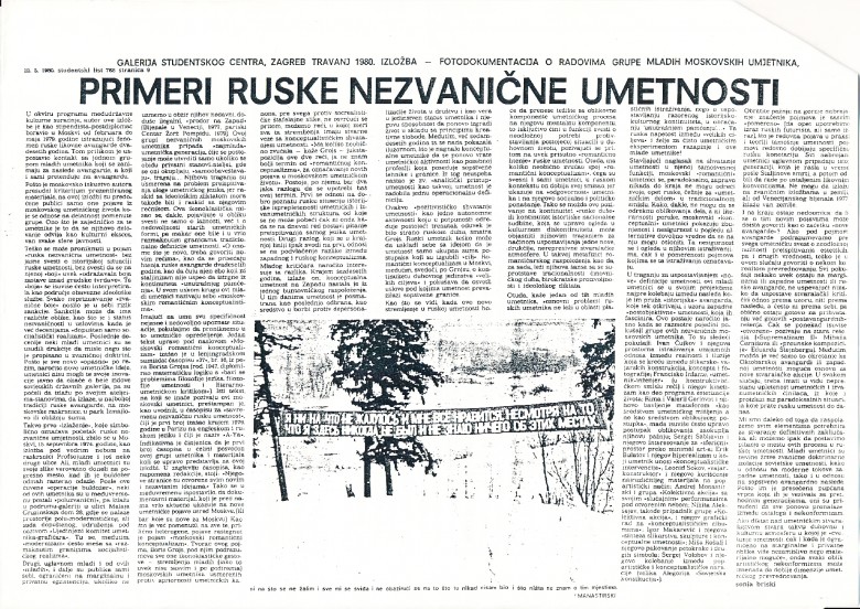 članak povodom izložbe "Radovi - Fotofokumentacija grupe moskovskih umjetnika iz sedamdesetih godina (drugi put)" u Galeriji Proširenih medija, Studentski list 768, 23.05.1980., str.9