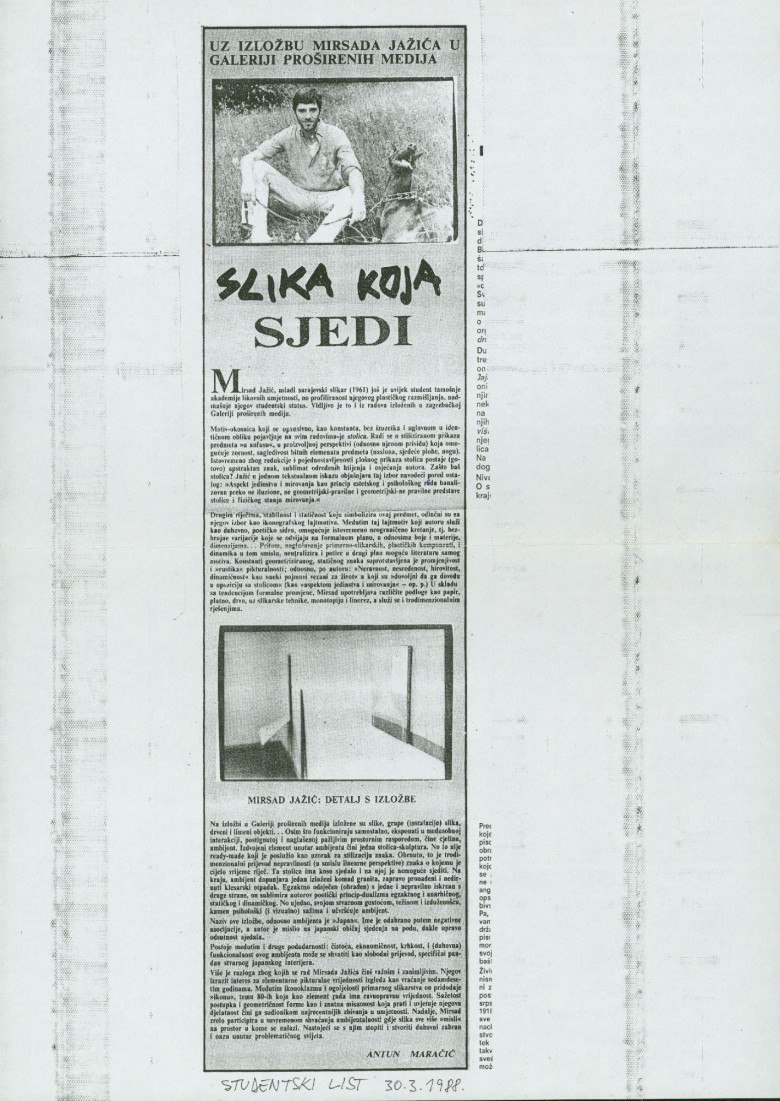 članak povodom izložbe Mirsada Jažića u Galeriji Proširenih medija, Studentski list, 30.03.1988.
