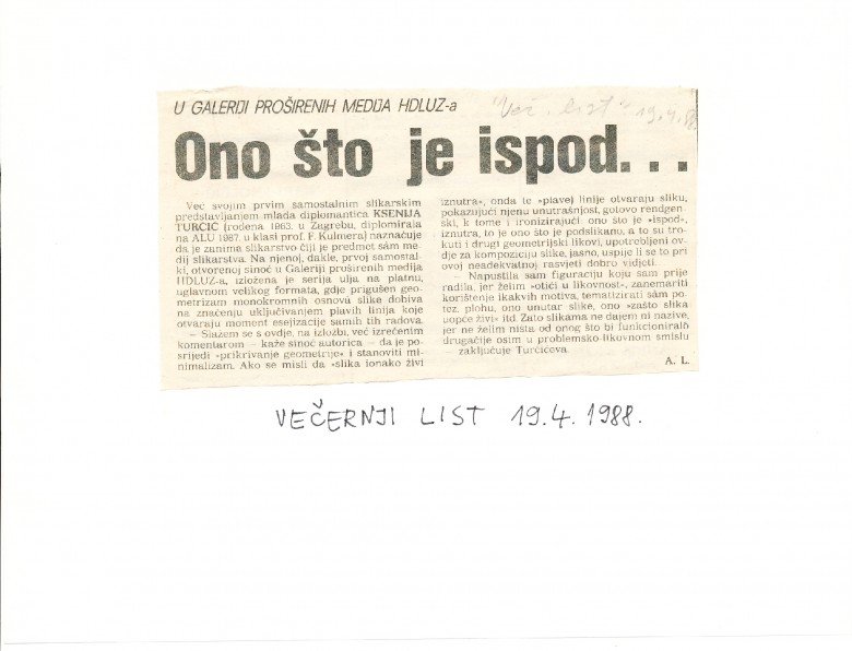 članak povodom izložbe Ksenije Turčić u Galeriji Proširenih medija, Večernji list, 19.04.1988.
