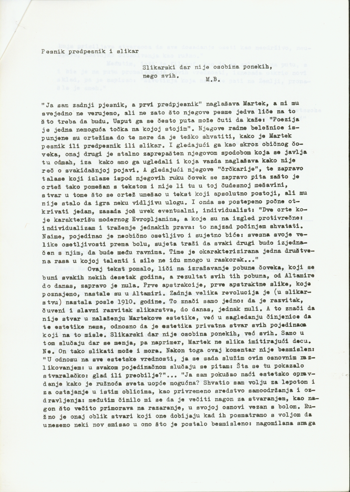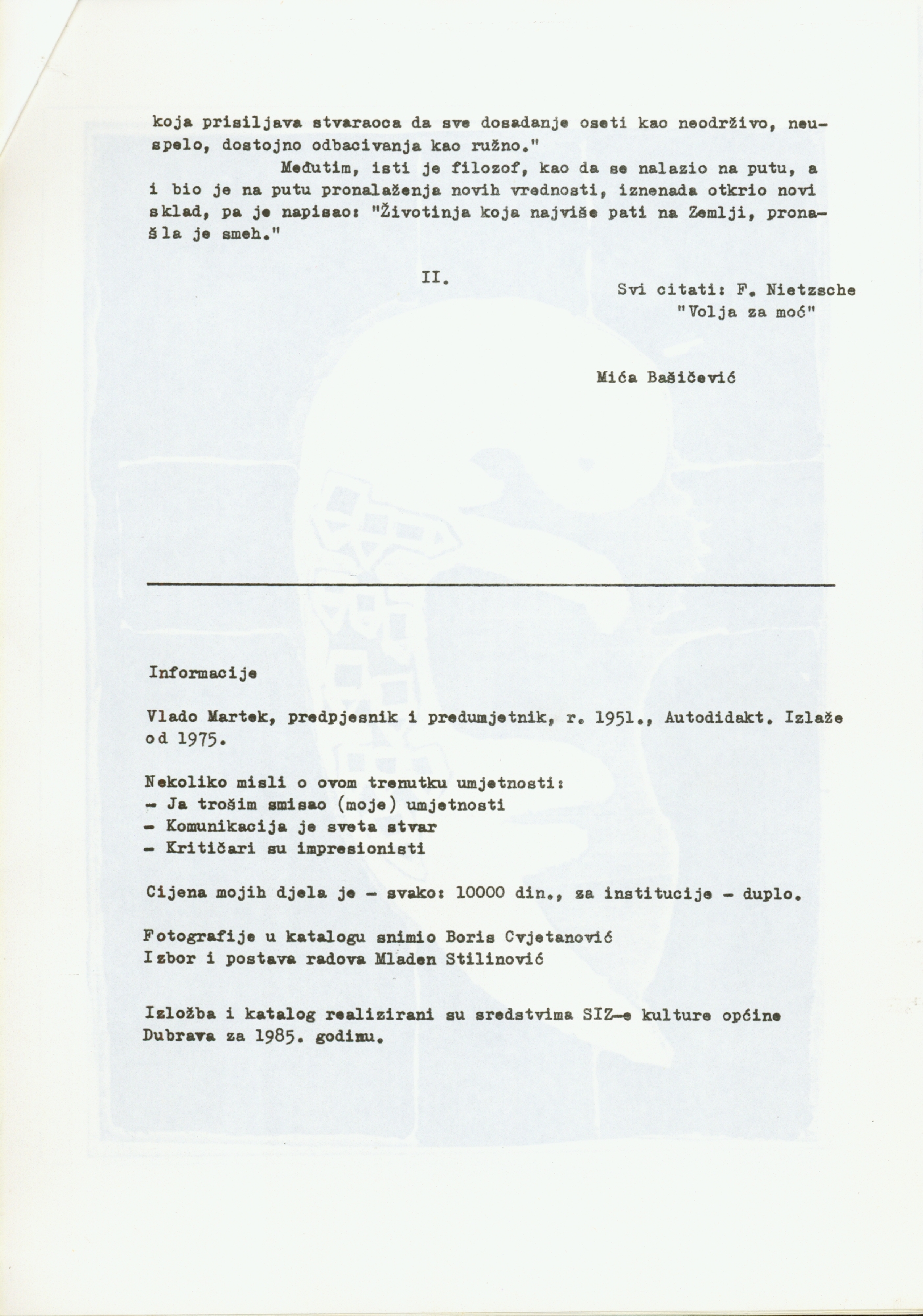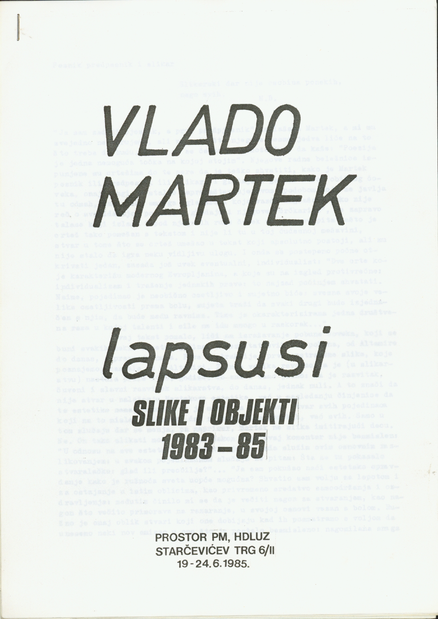 katalog izložbe "lapsusi - Slike i objekti 1983-85" Vlade Marteka u PM; text "Pesnik, predpesnik i slikar" Miće Bašičevića