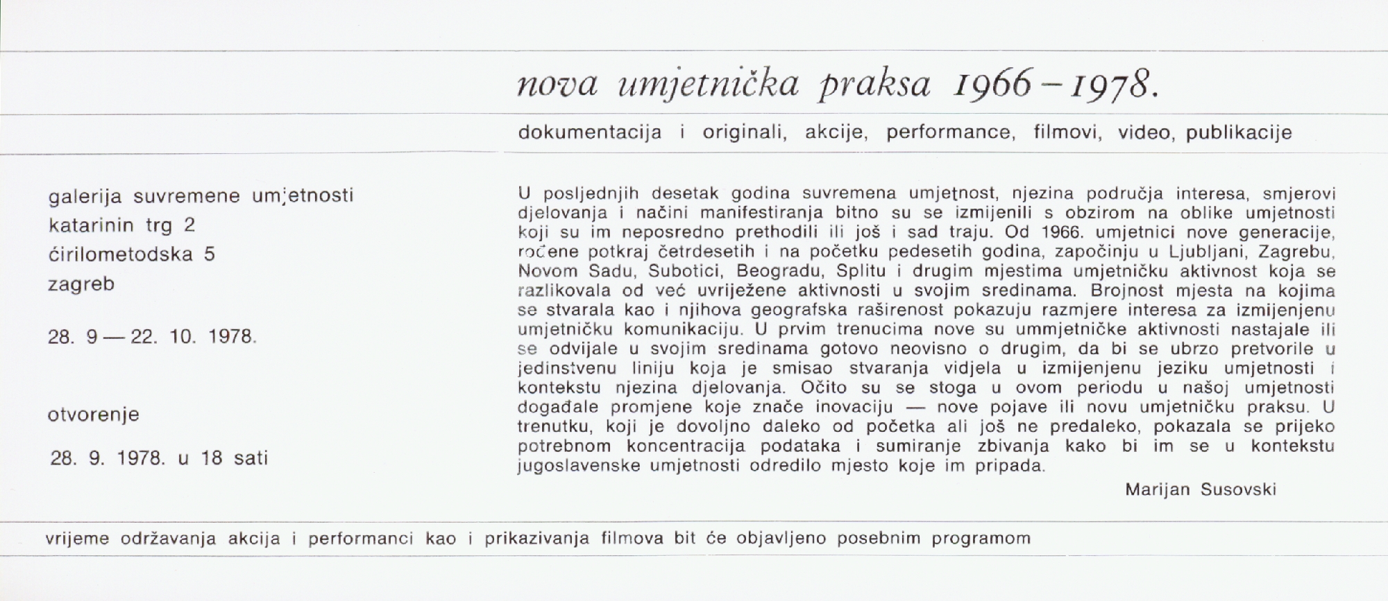 pozivnica za izložbu "Nova umjetnička praksa 1966 - 1978"