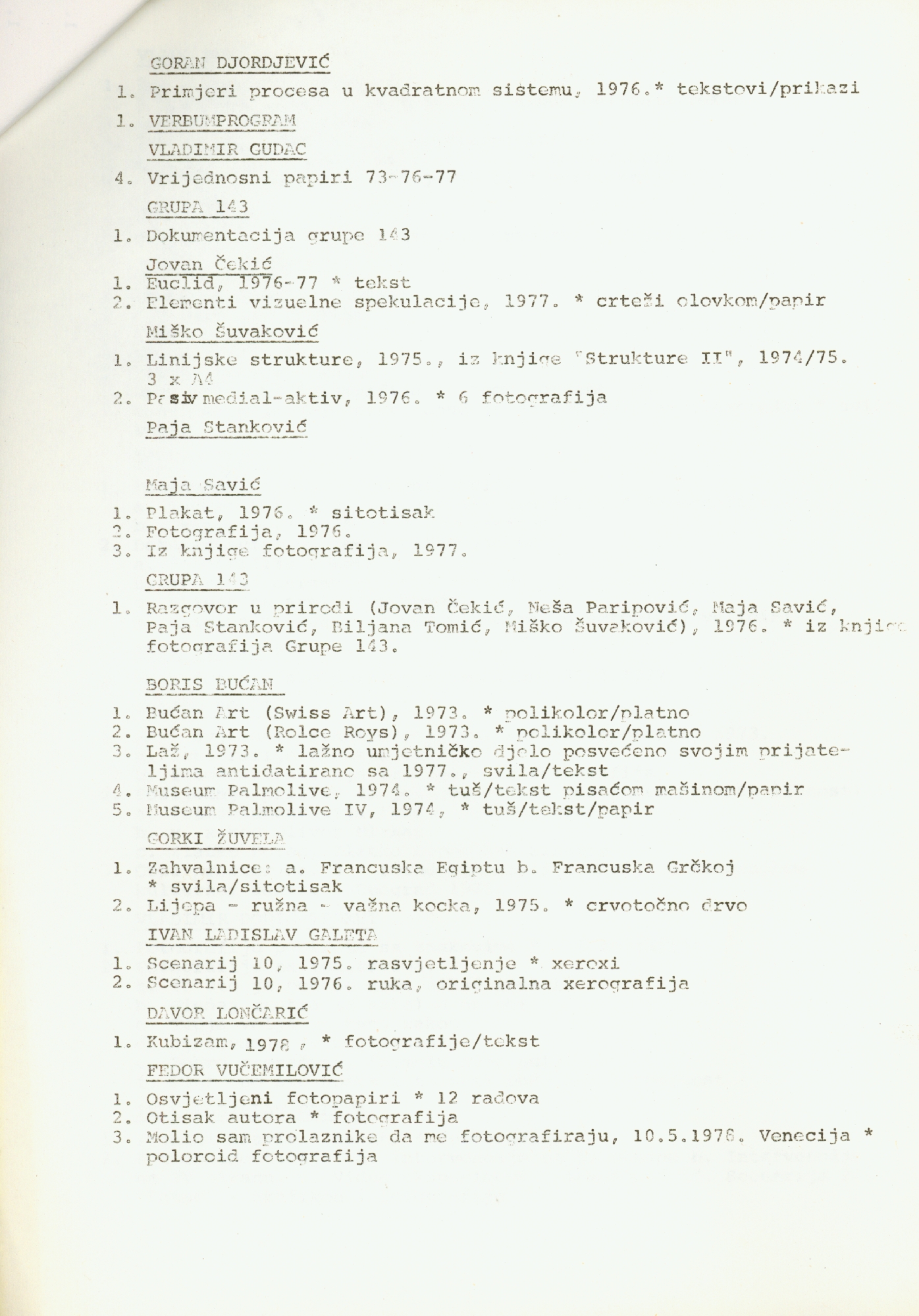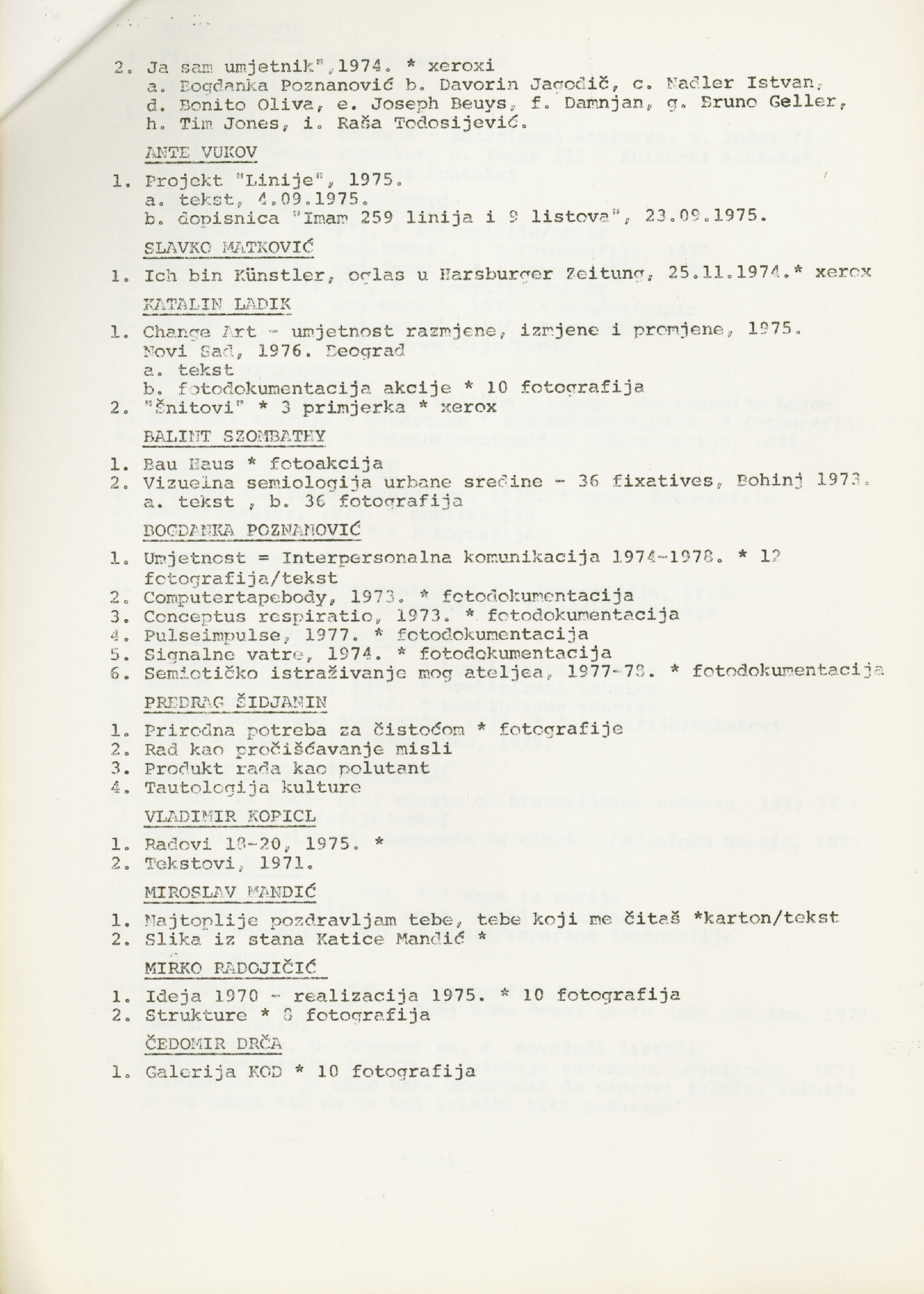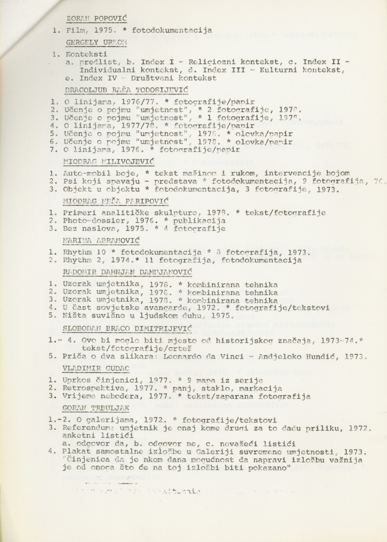 popis umjetnika i njihovih radova na izložbi "Nova umjetnička praksa 1966-1978" na hrvatskom jeziku