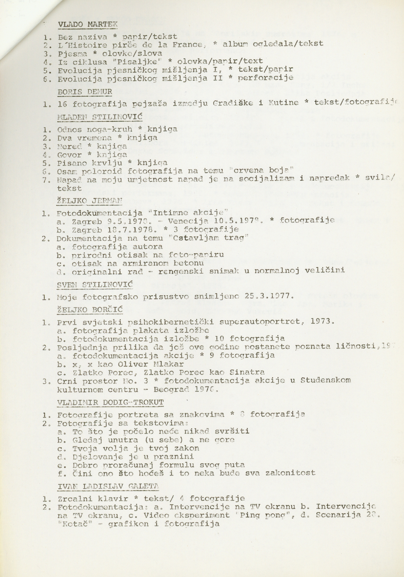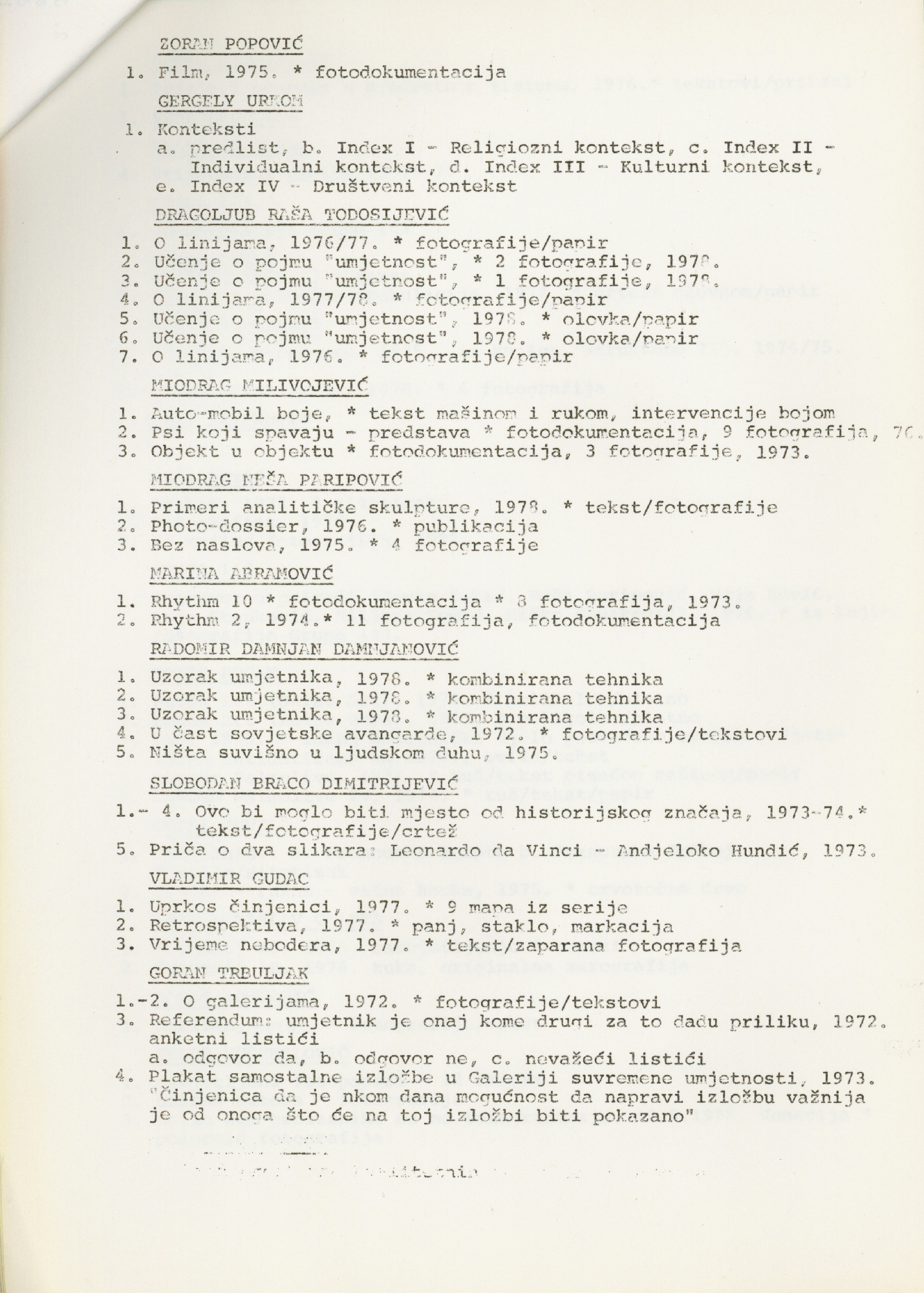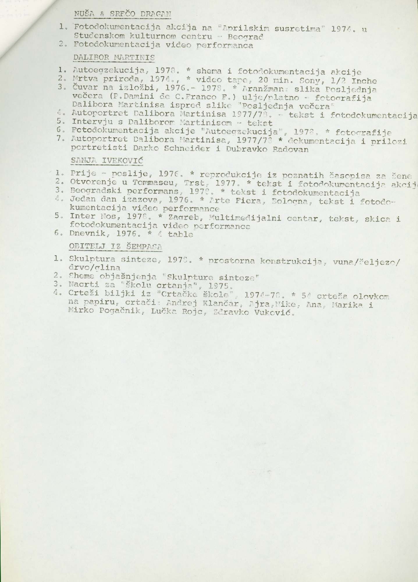 popis umjetnika i njihovih radova na izložbi "Nova umjetnička praksa 1966-1978" na hrvatskom jeziku