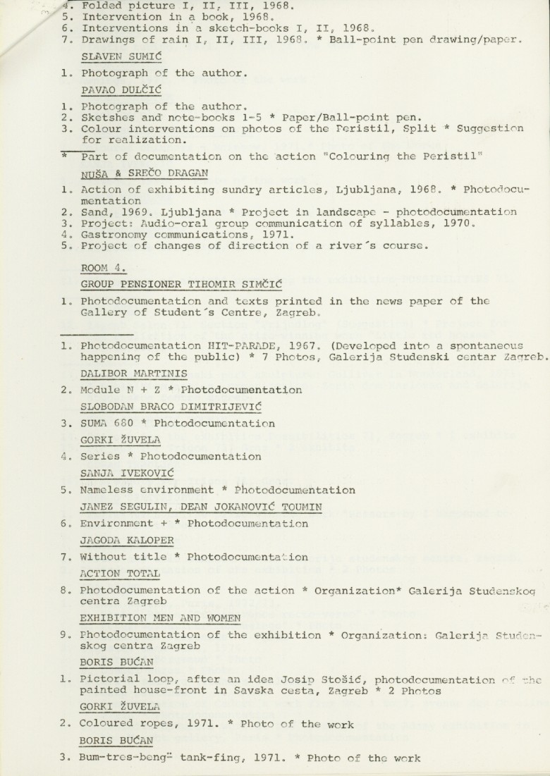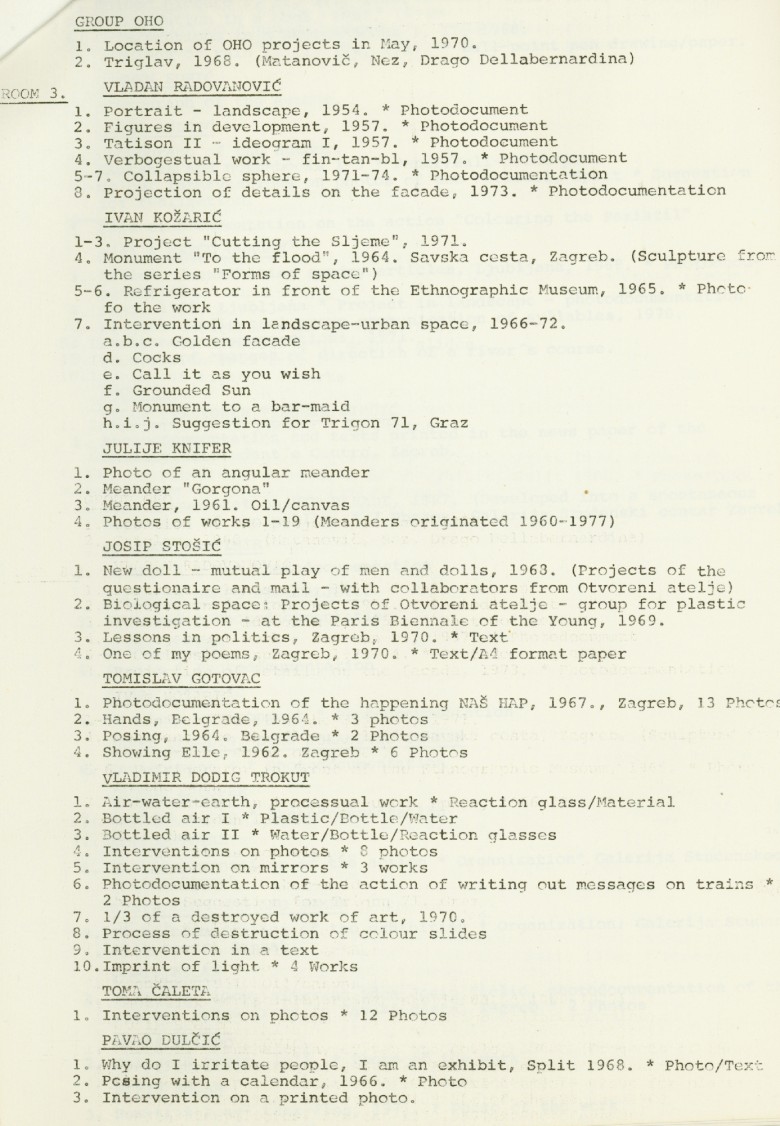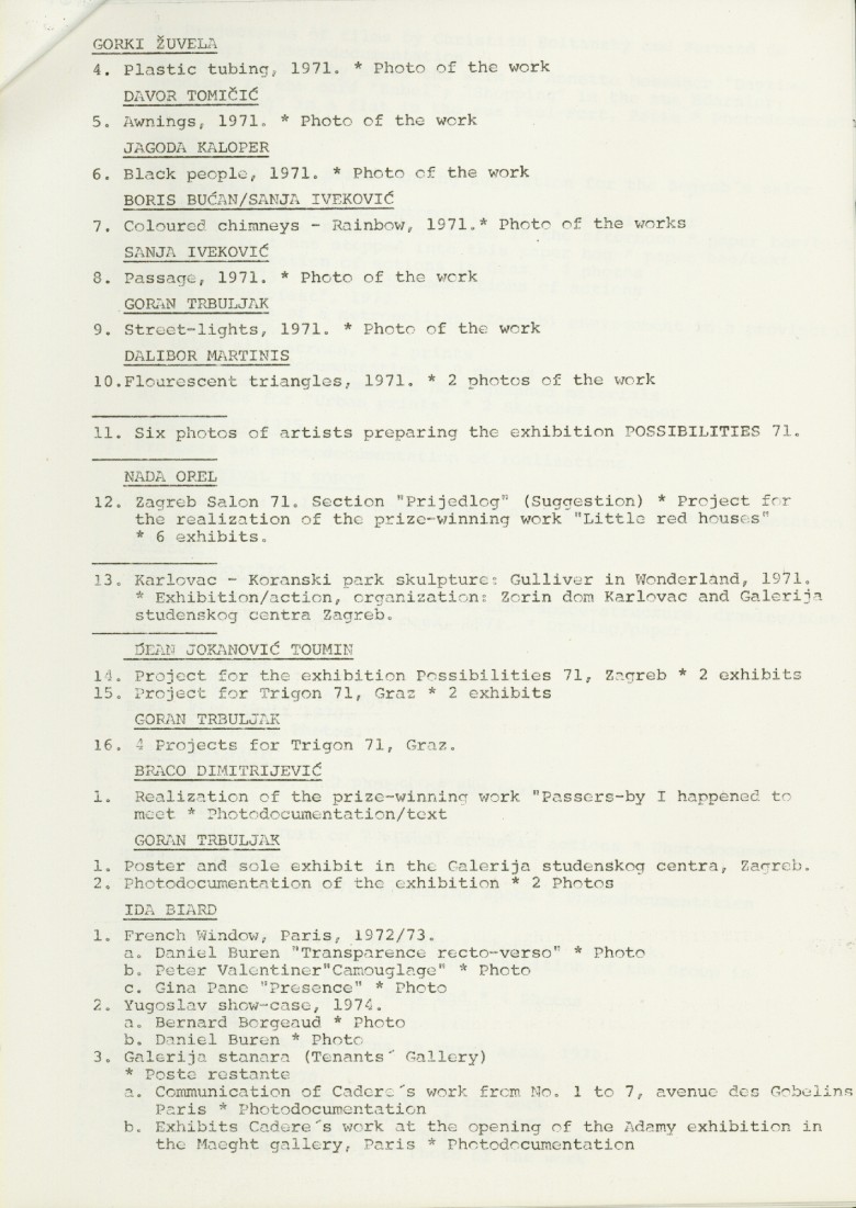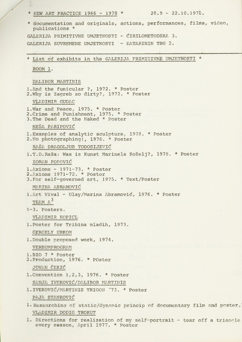 popis umjetnika i njihovih radova na izložbi "Nova umjetnička praksa 1966-1978" na engleskom jeziku