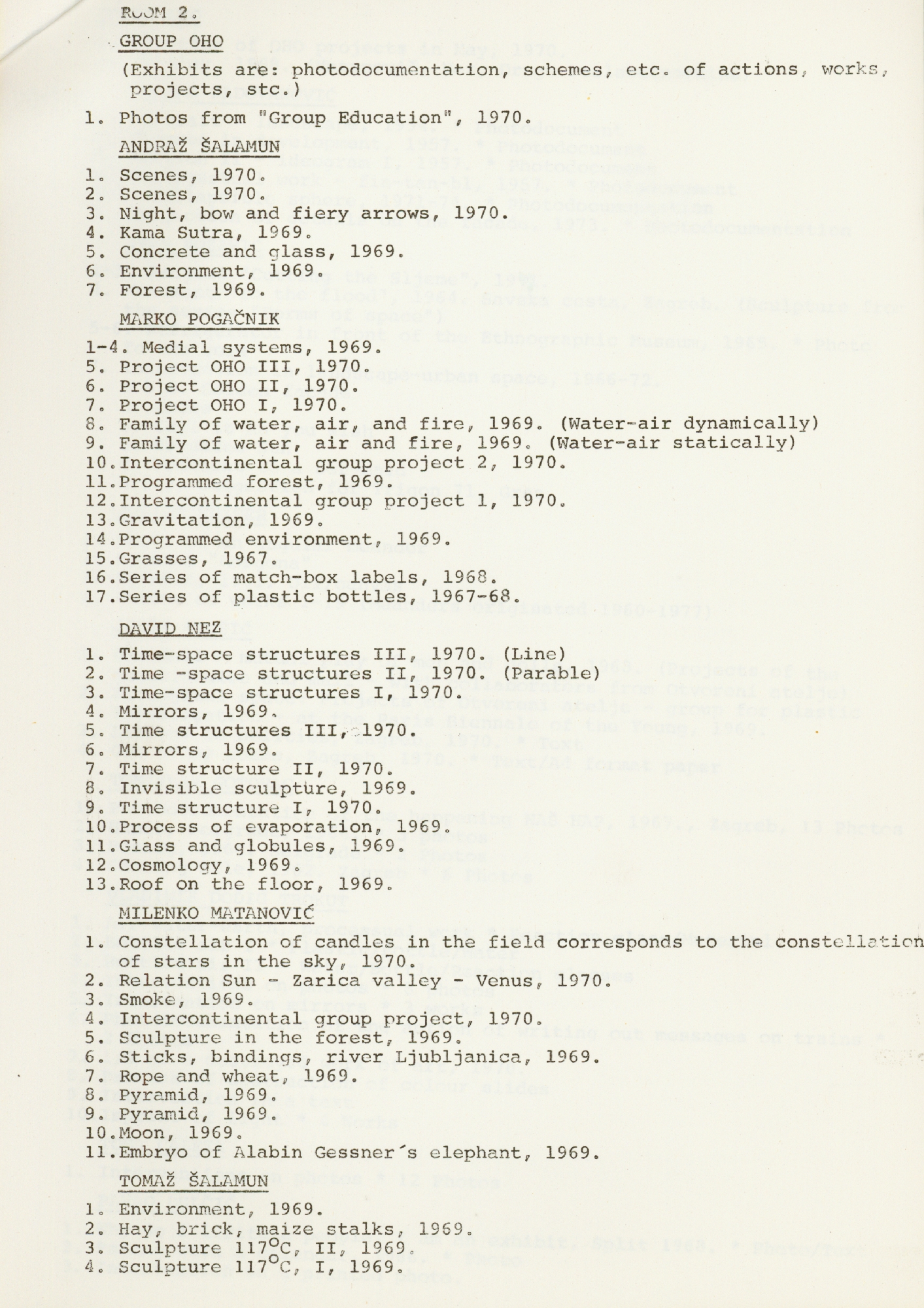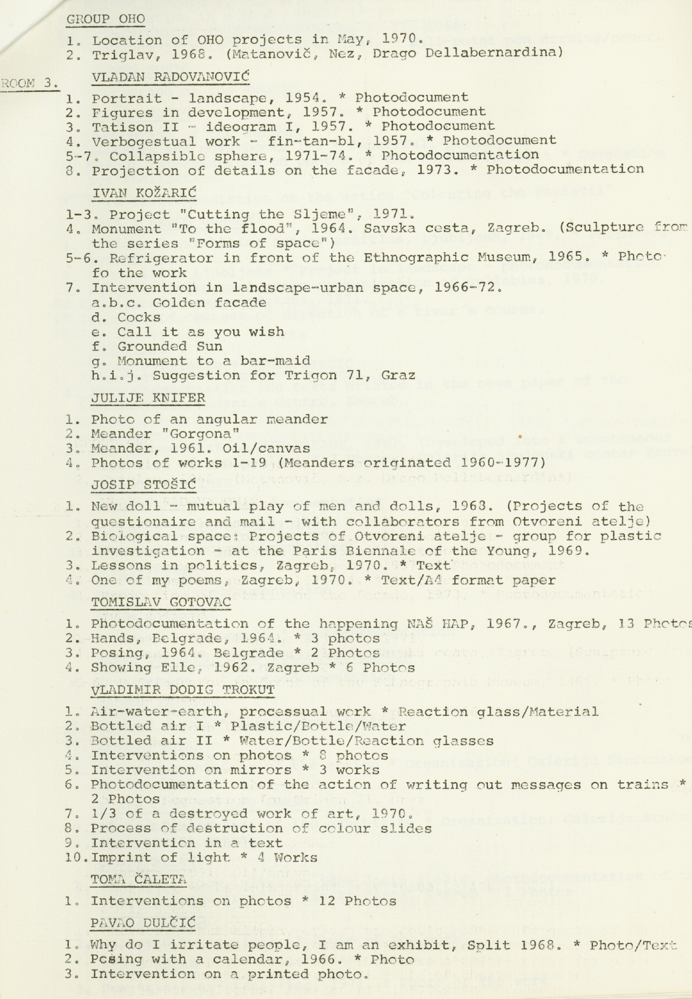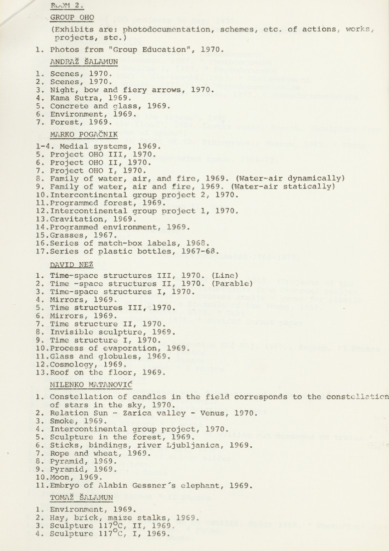 popis umjetnika i njihovih radova na izložbi "Nova umjetnička praksa 1966-1978" na engleskom jeziku