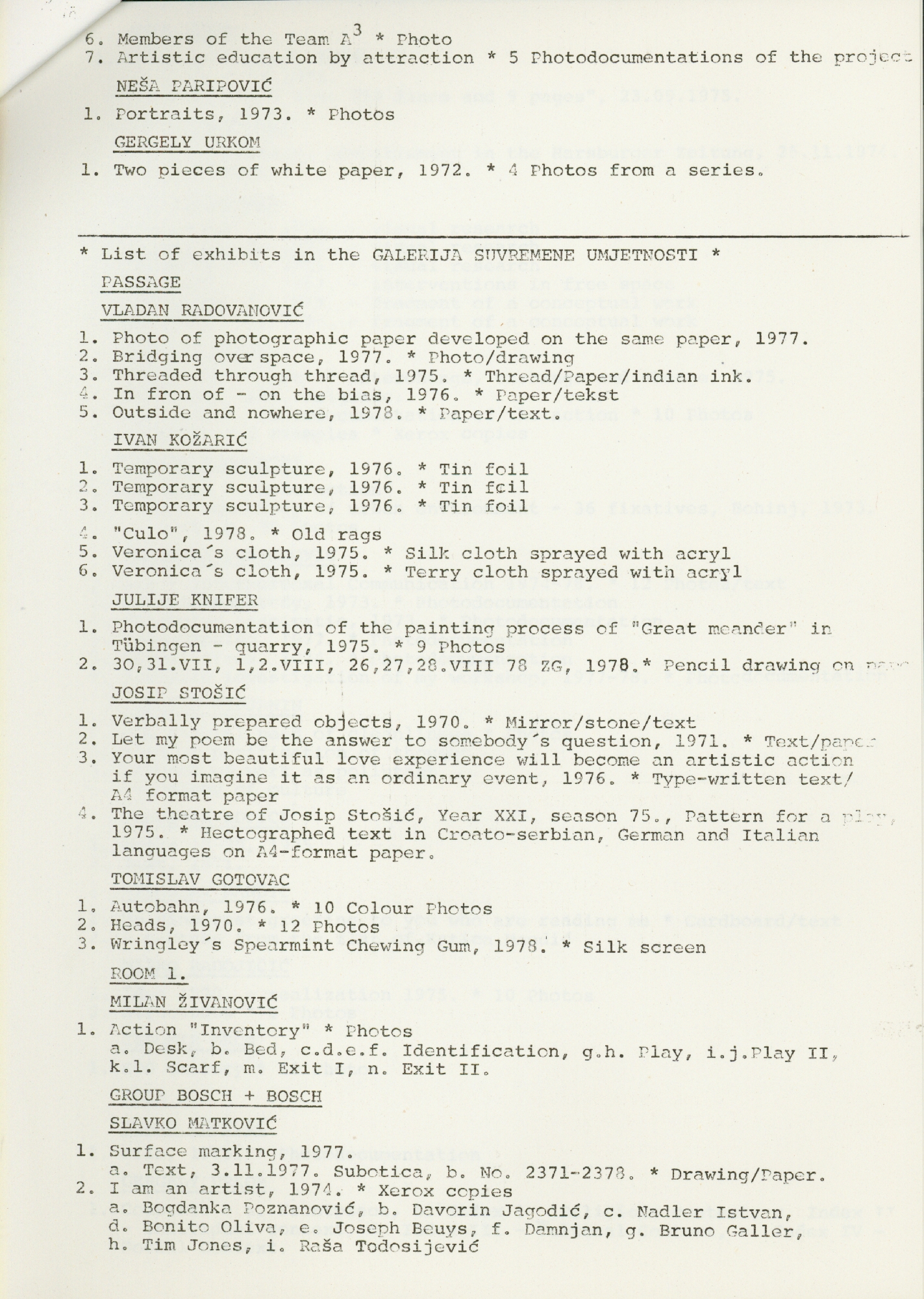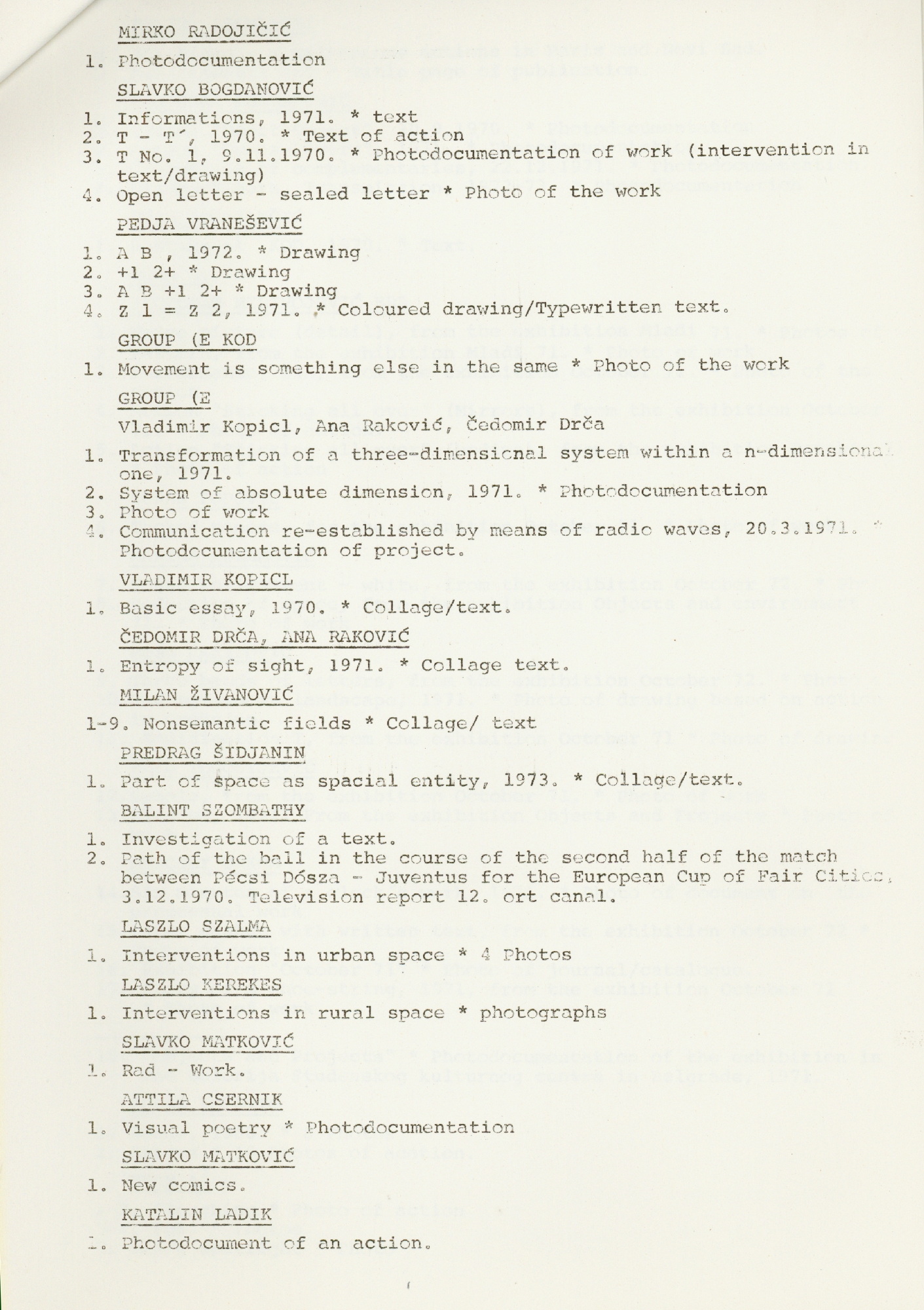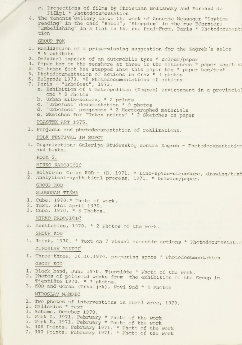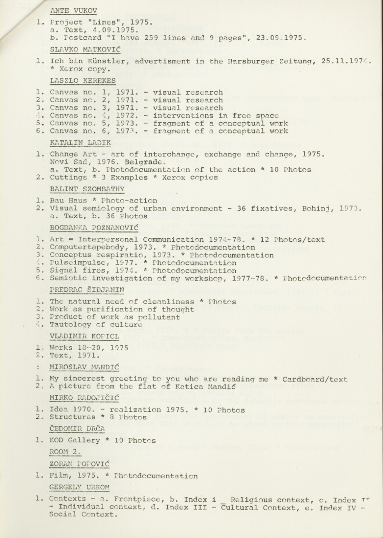 popis umjetnika i njihovih radova na izložbi "Nova umjetnička praksa 1966-1978" na engleskom jeziku