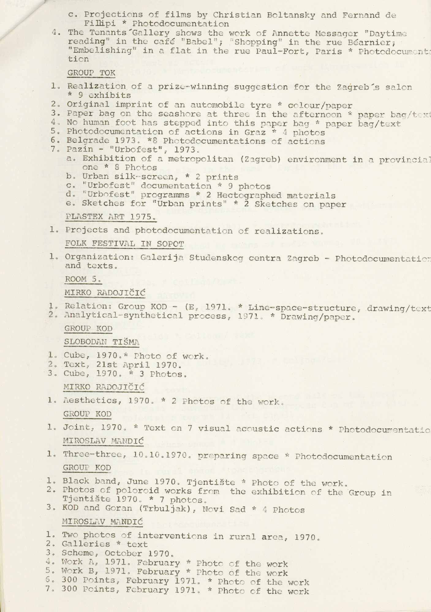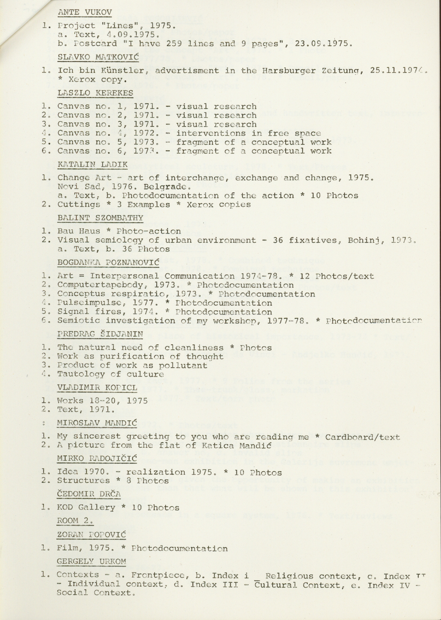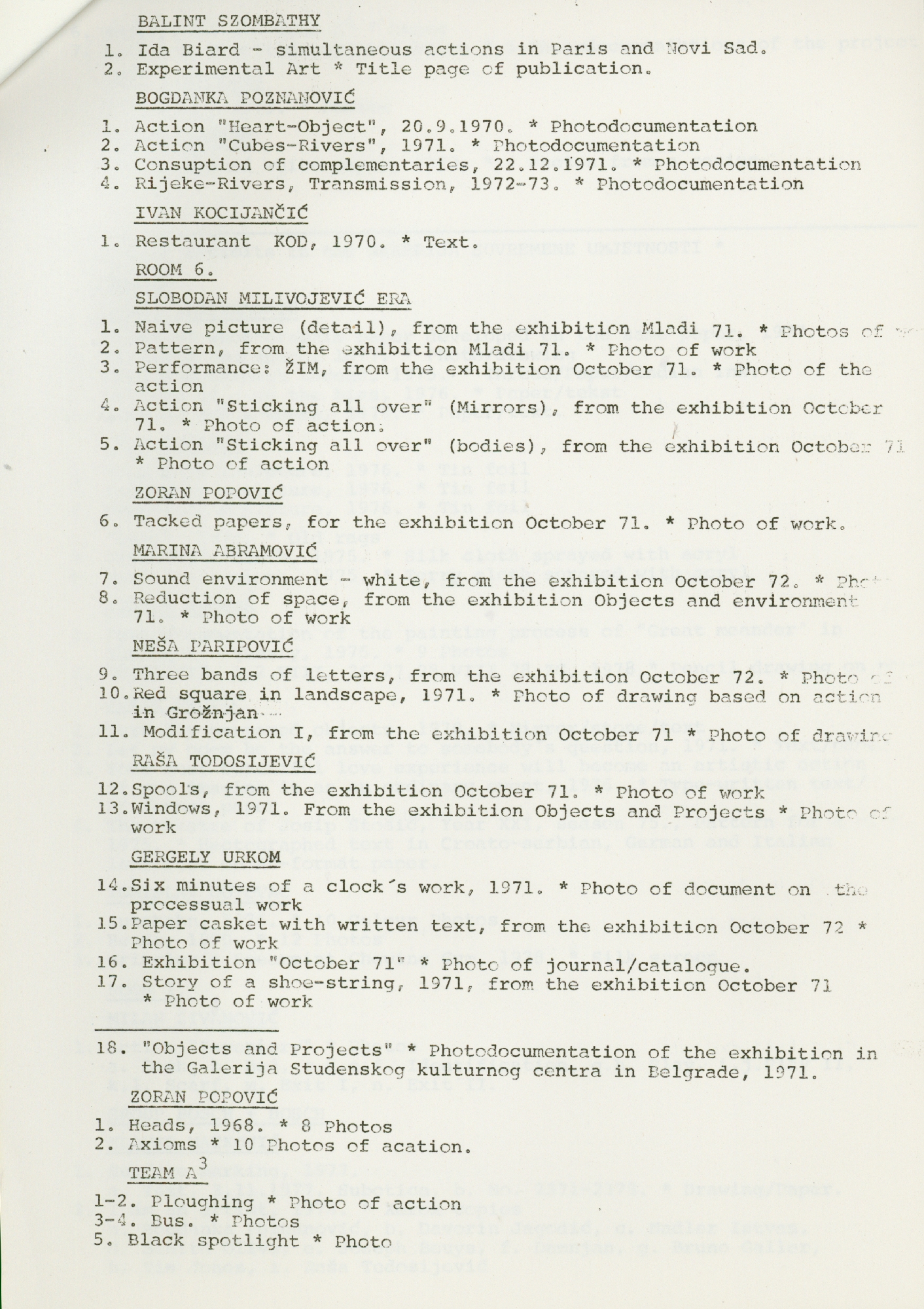popis umjetnika i njihovih radova na izložbi "Nova umjetnička praksa 1966-1978" na engleskom jeziku
