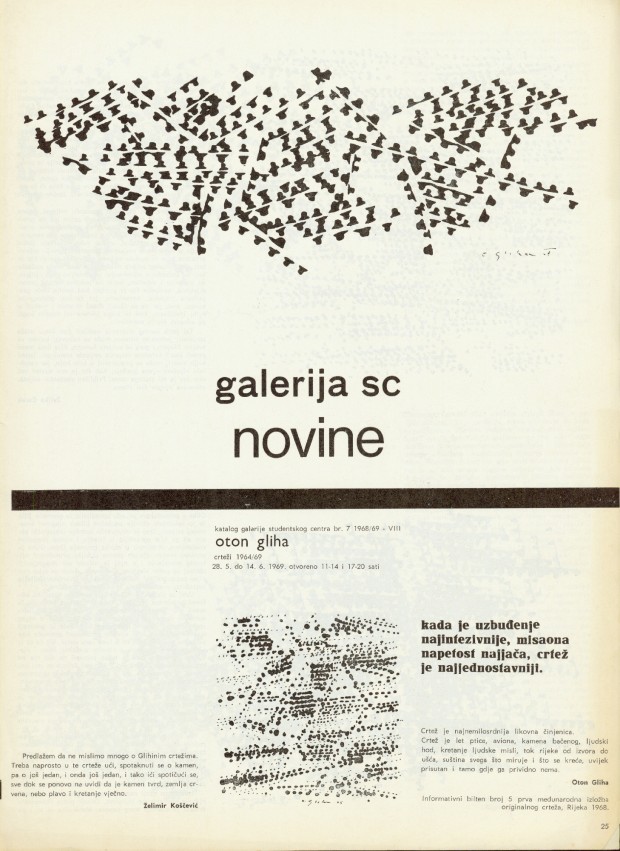University Student Centre, Student Centre Gallery, Zagreb, Savska 25; poster and catalogue ue: Tomičić; press: grafički školski centar; 700 copies printed; Želimir Koščević, Oton Gliha, Željka Čorak, Vladimir Marković