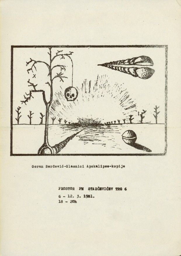 flyer of the exhibition "Glasnici apokalipse - kopije" of Goran Đorđević in PM