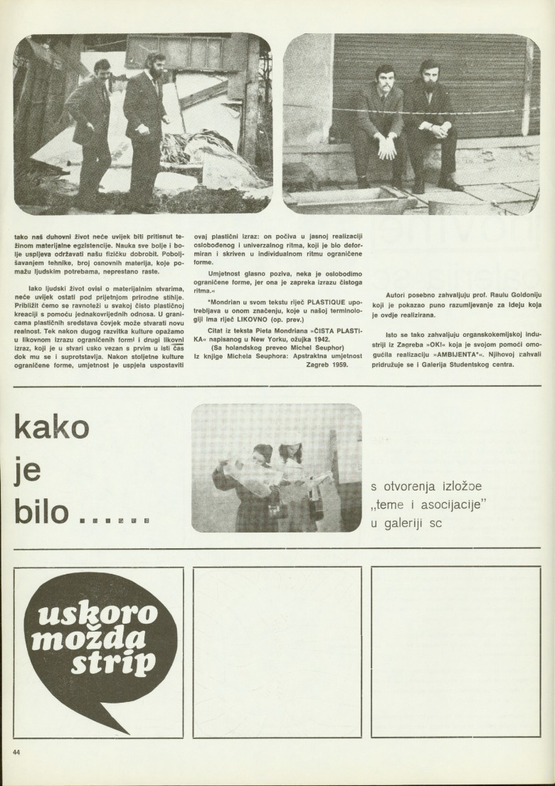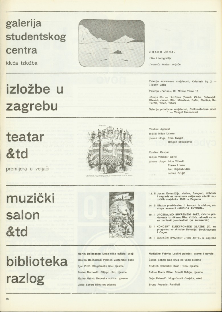 University Student Centre, Student Centre Gallery, Zagreb, Savska 25; poster: B. Bućan; catalogue ue: D. Tomičić; photography: V. Jakolić; 500 copies printed; press: Medicinska naklada, Zagreb, Šalata 3; Dejan Jokanović, Janez Segolin, Lev Nusberg