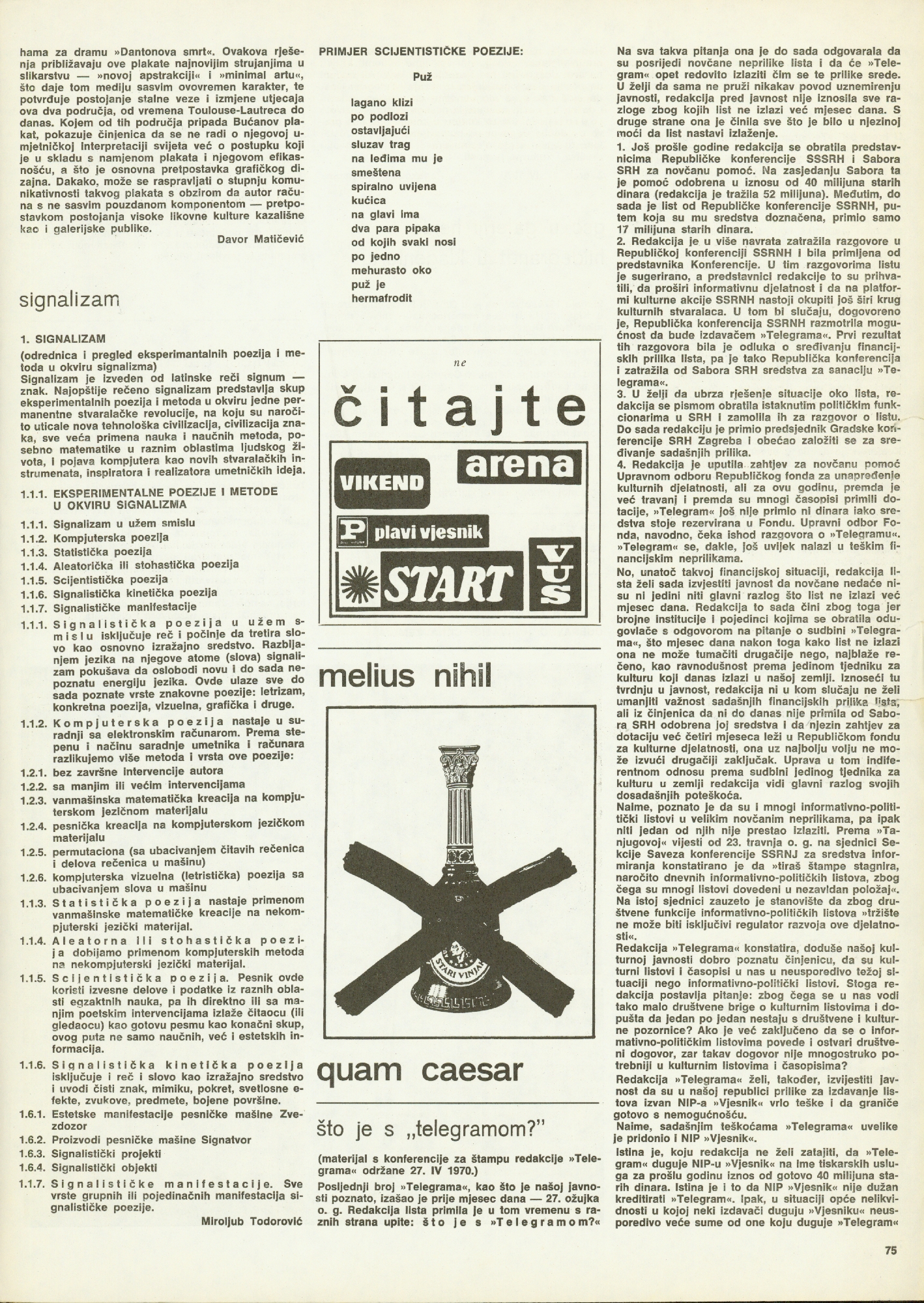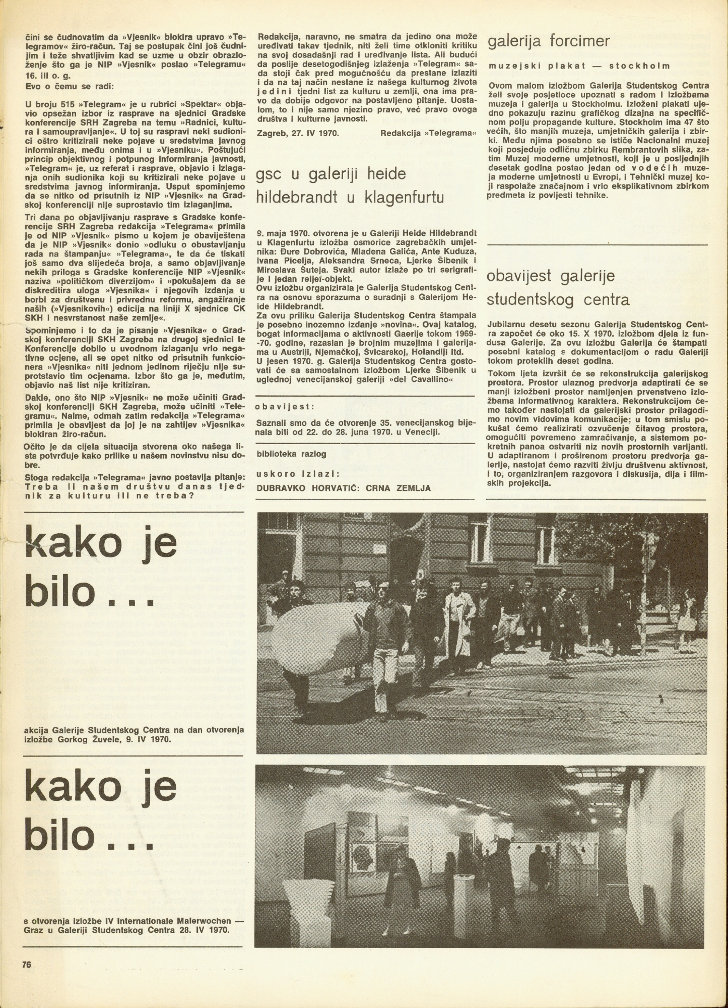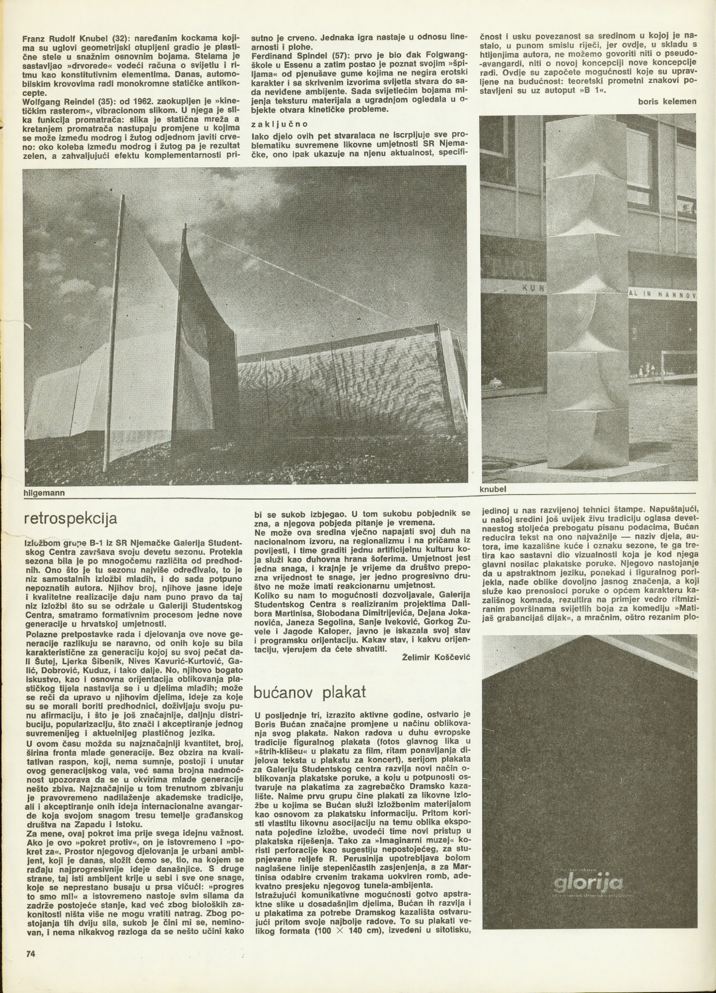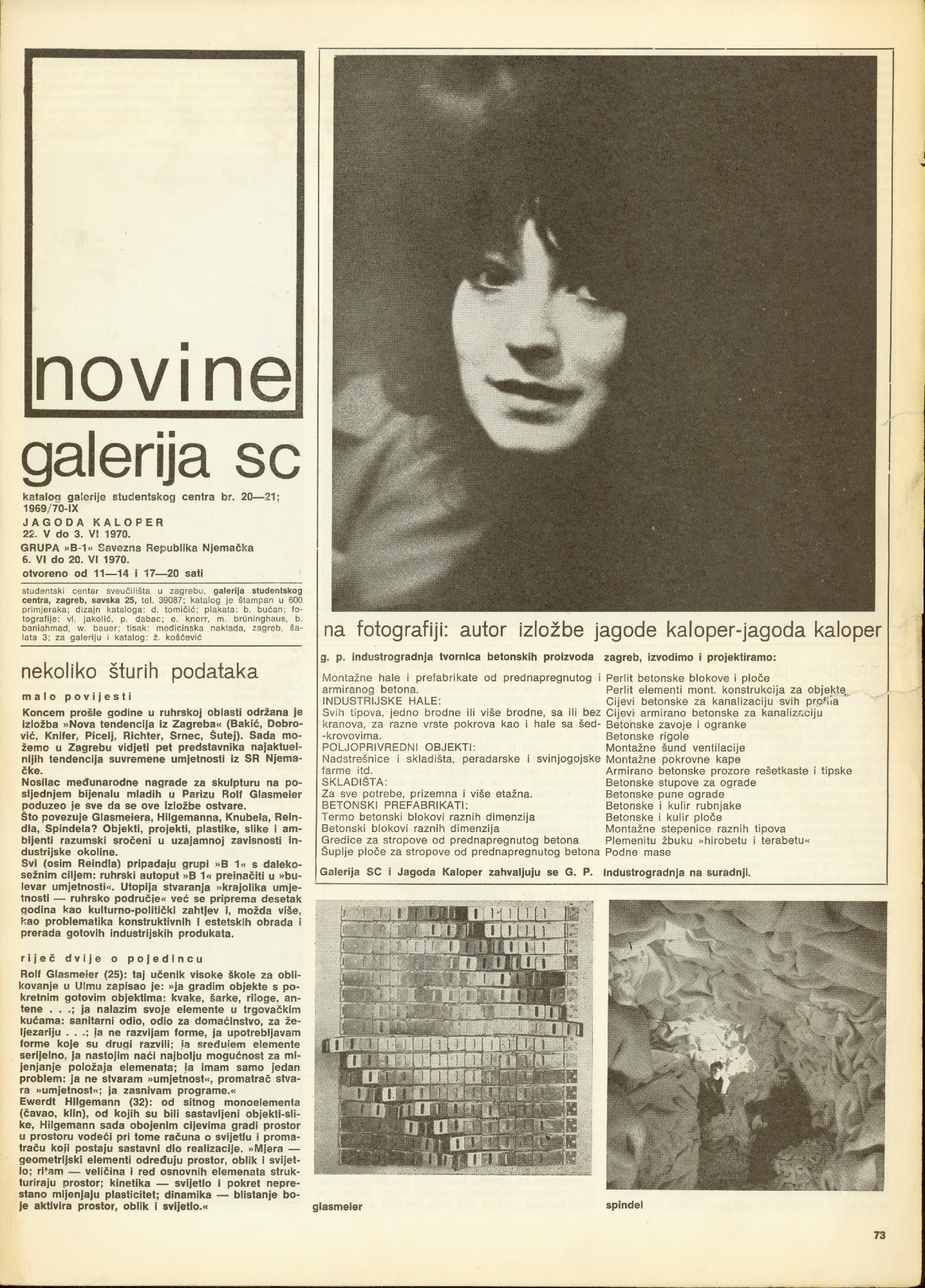 University Student centre, Student Centre Gallery, Zagreb, Savska 25; poster: B. Bućan; catalogue ue: D. Tomičić; photography: Vl. Jakolić, P. Dabac, E. Knorr, M Brüninghaus, B. Baniahmad, W. Bauer; 800 copies printed; press: Medicinska naklada, Zagreb, Šalata 3; for the gallery and catalogue ue: Želimir Koščević; Jagoda Kaloper, njemačka Grupa "B-1", Glasmeier, Spindel, Hilgemann, Knubel, Boris Kelemen, Davor Matičević, Miroljub Todorović