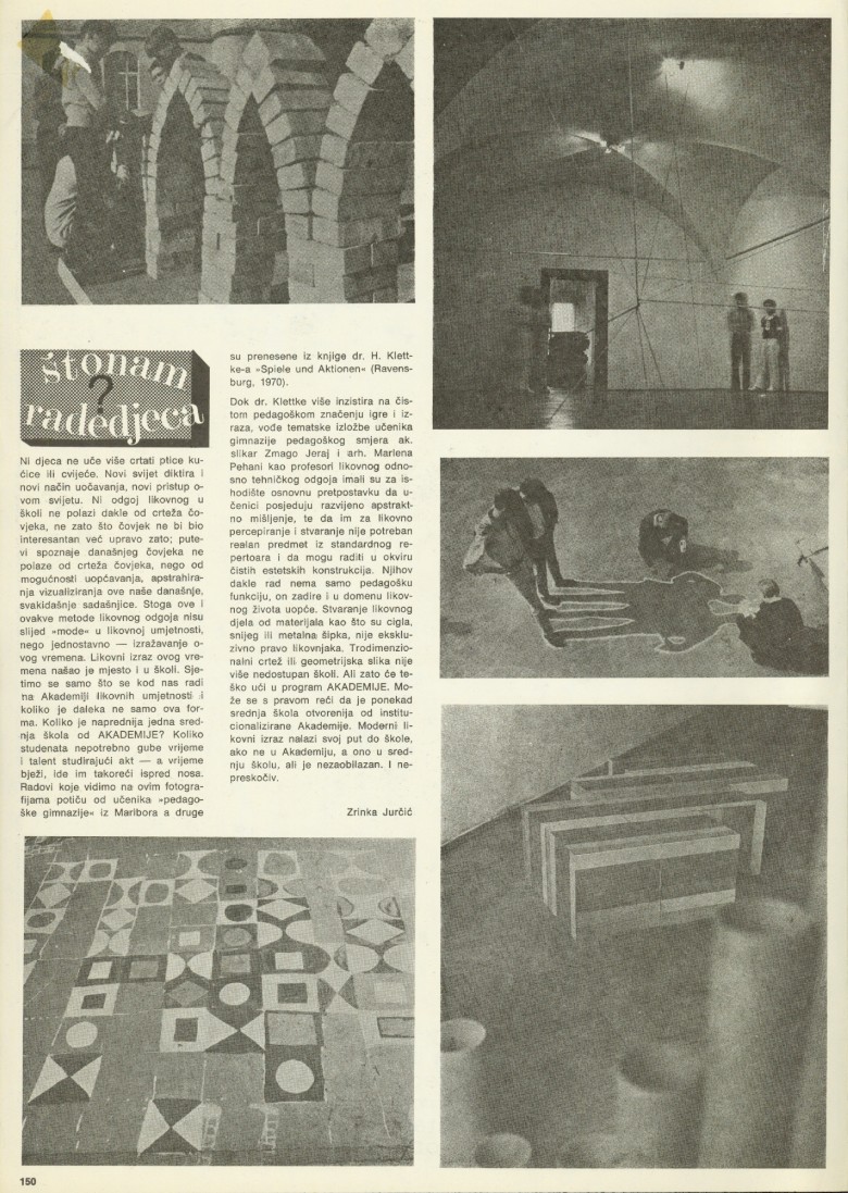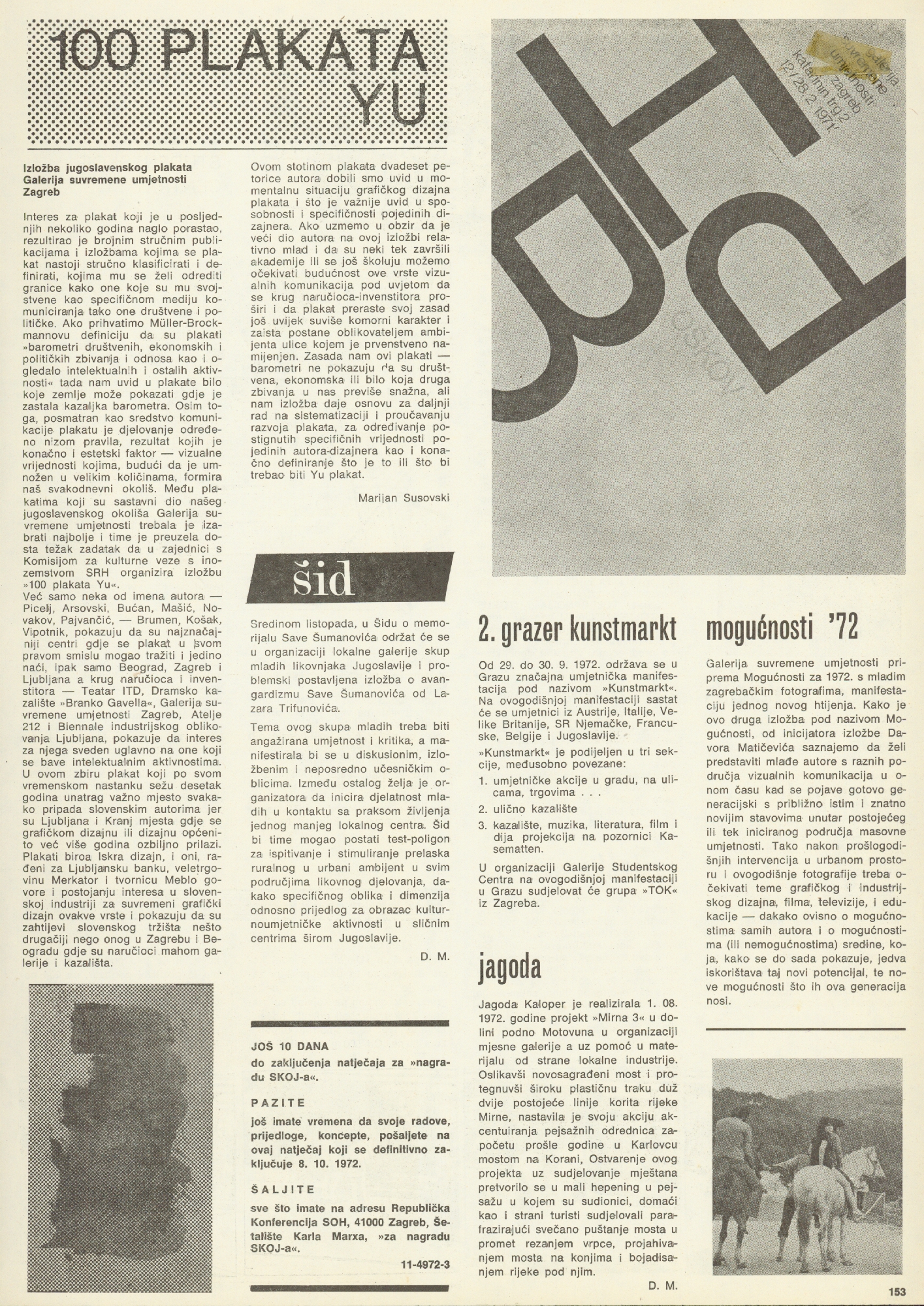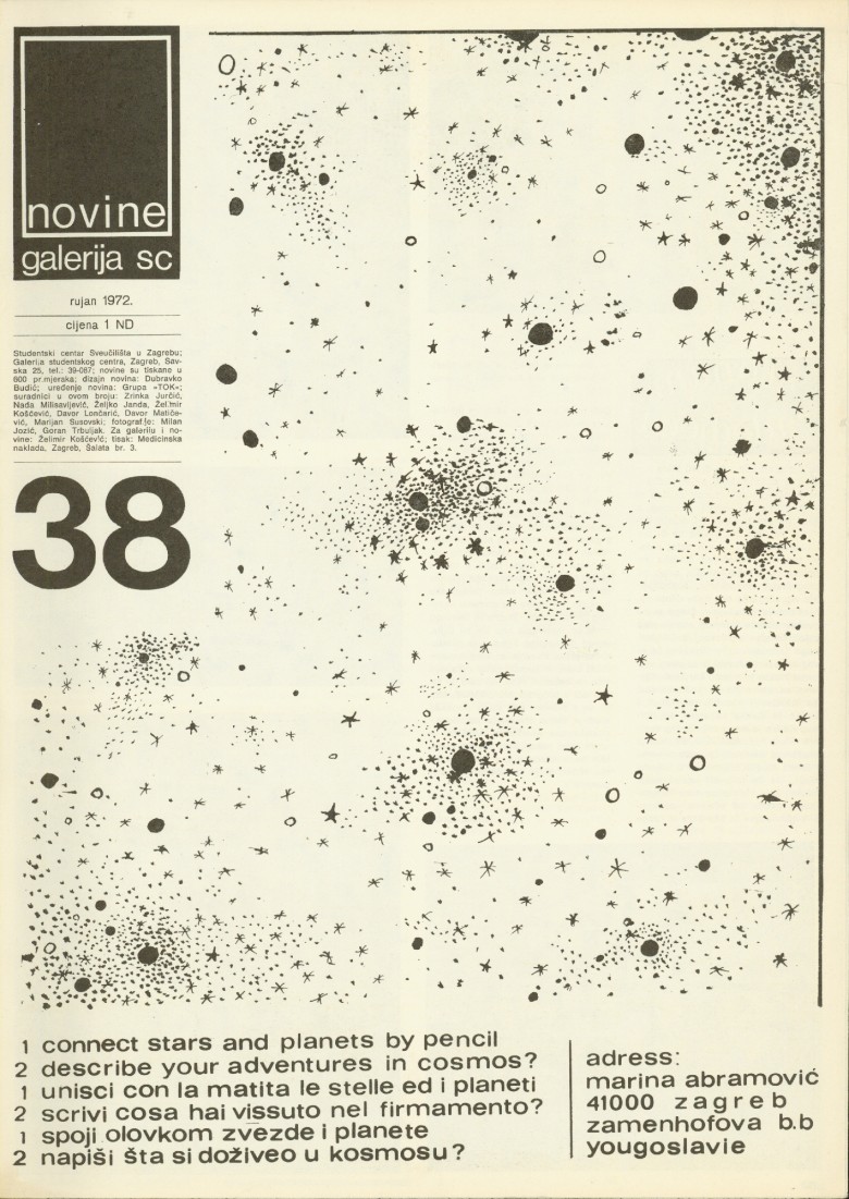price 1 ND; University Student Centre, Student Centre Gallery, Zagreb, Savska 25; newspaper: Dubravko Budić; editor: grupa TOK; photography: Milan Jozić, Goran Trbuljak; 600 copies printed; press: Medicinska naklada, Zagreb, Šalata 3; for newspaper and gallery: Želimir Koščević; collaborators: Zrinka Jurčić, Nada Milisavljević, Željko Janda, Želimir Koščević, Davor Lončarić, Davor Matičević, Marijan Susovski; Marina Abramović, Grupa za akciju i anonimnu atrakciju, Jagoda Kaloper, Oscar Schlemmer, Laszlo Moholy-Nagy