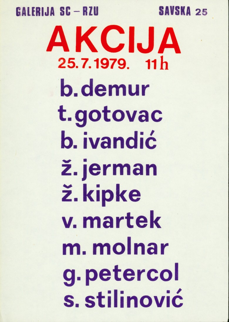 invitiation on the action in Galerija SC, Savska 25; Goran Petercol, Boris Demur, Željko Jerman, Vlado Martek, Željko Kipke, Marijan Molnar, Tomislav Gotovac, Sven Stilinović