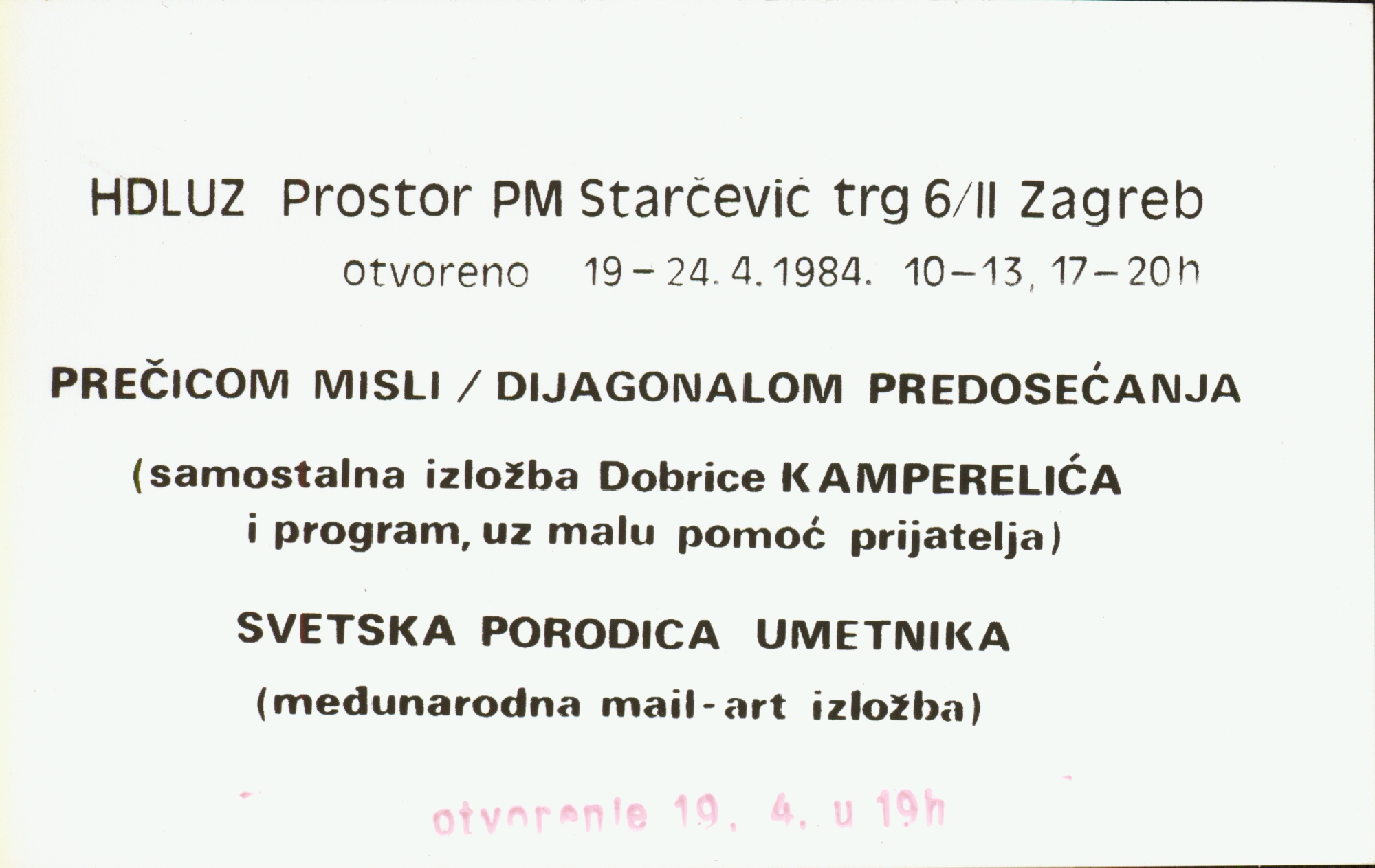 invitation card for the international exhibition Svetska porodica umetnika and solo exhibition "Prečicom misli / Dijagonalom predosjećanja" by Dobrica Kamperelić