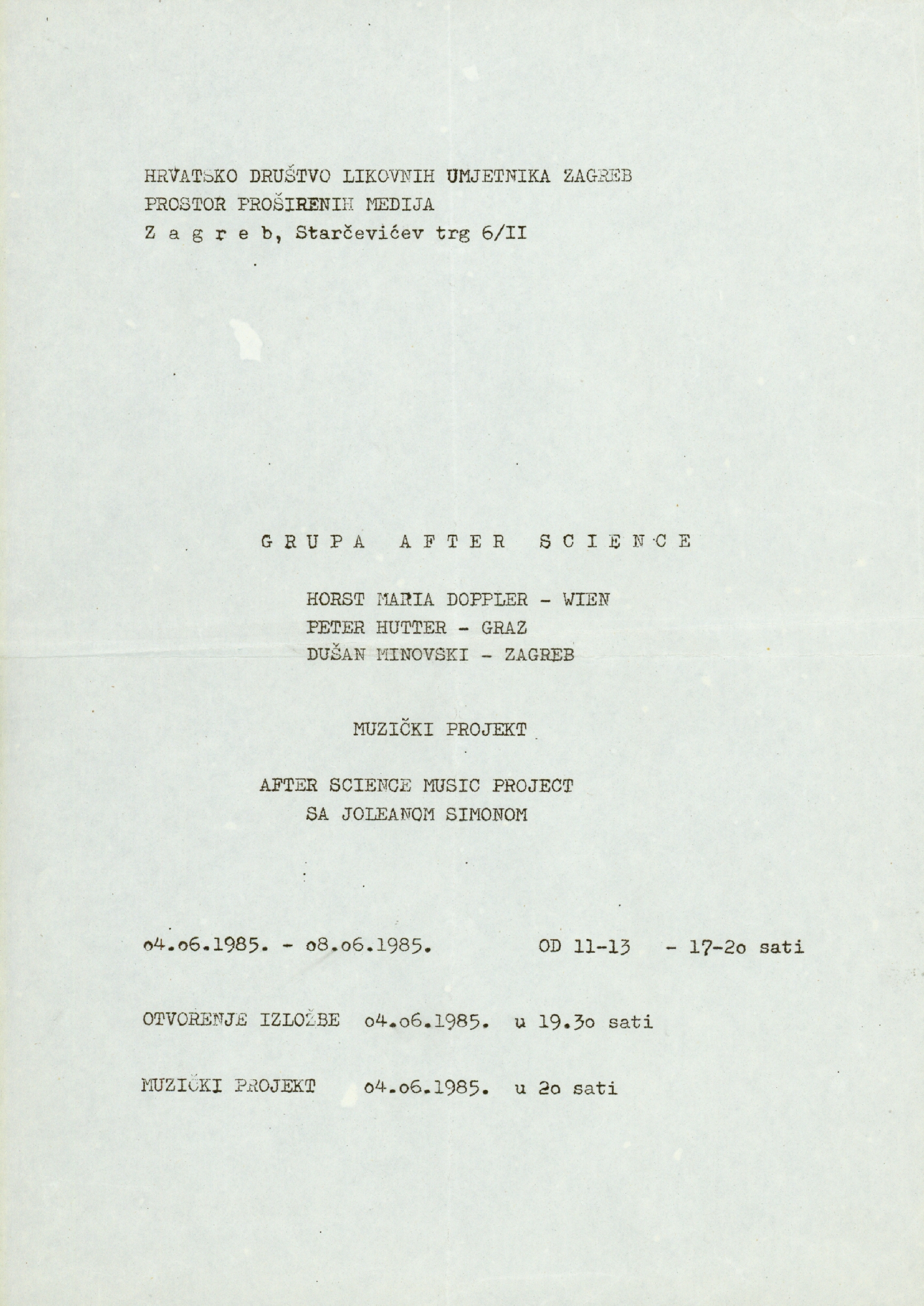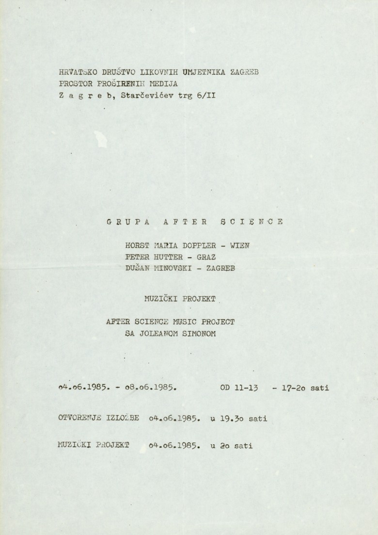 flyer of the exhibition of the group After Science (Horst Maria Doppler, Petter Hutter, Dušan Minovski) and of the musical project After Science (music project with Joleana Simon)