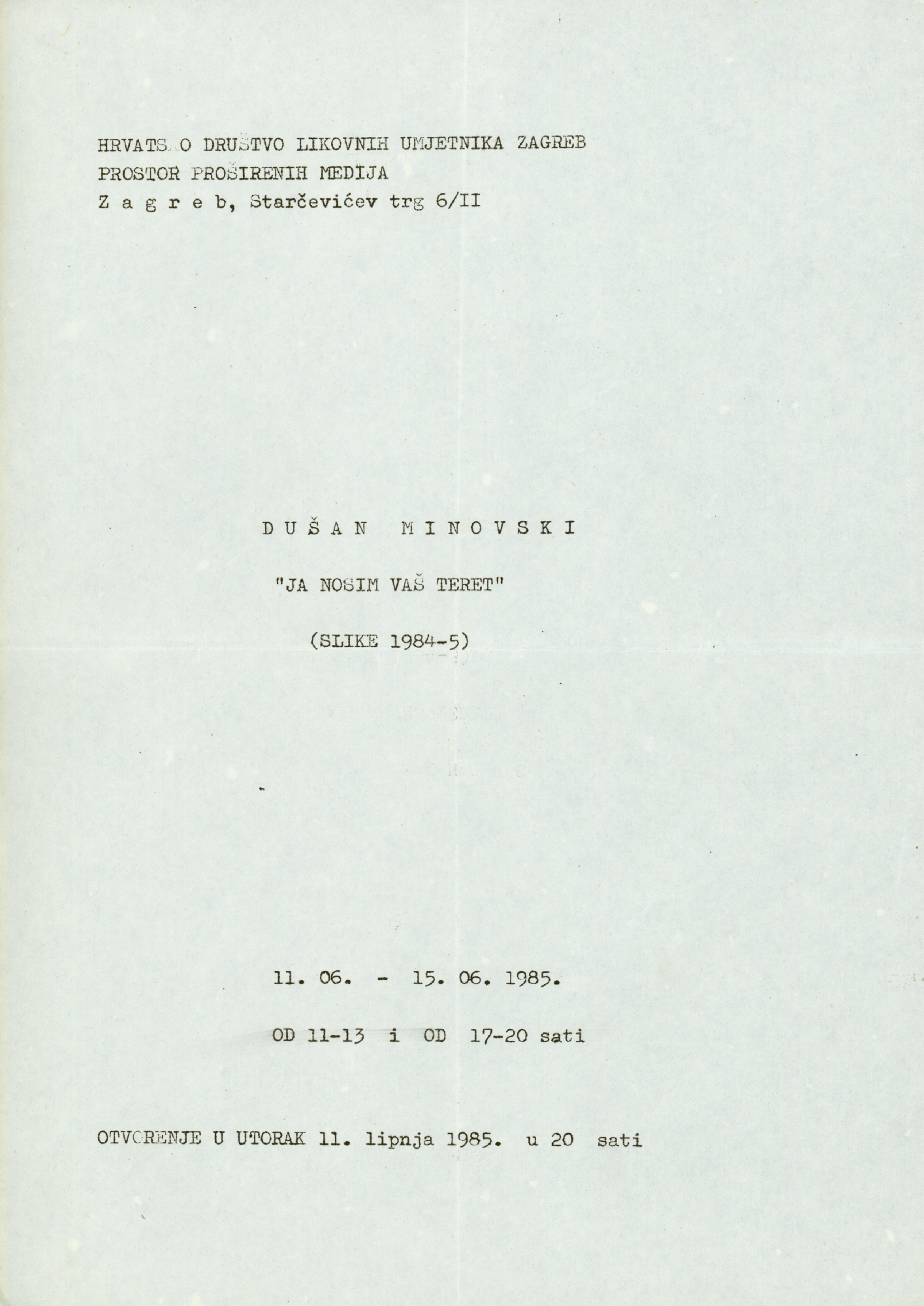 flyer of the exhibition "Ja nosim vaš teret" of Dušan Minovski in PM