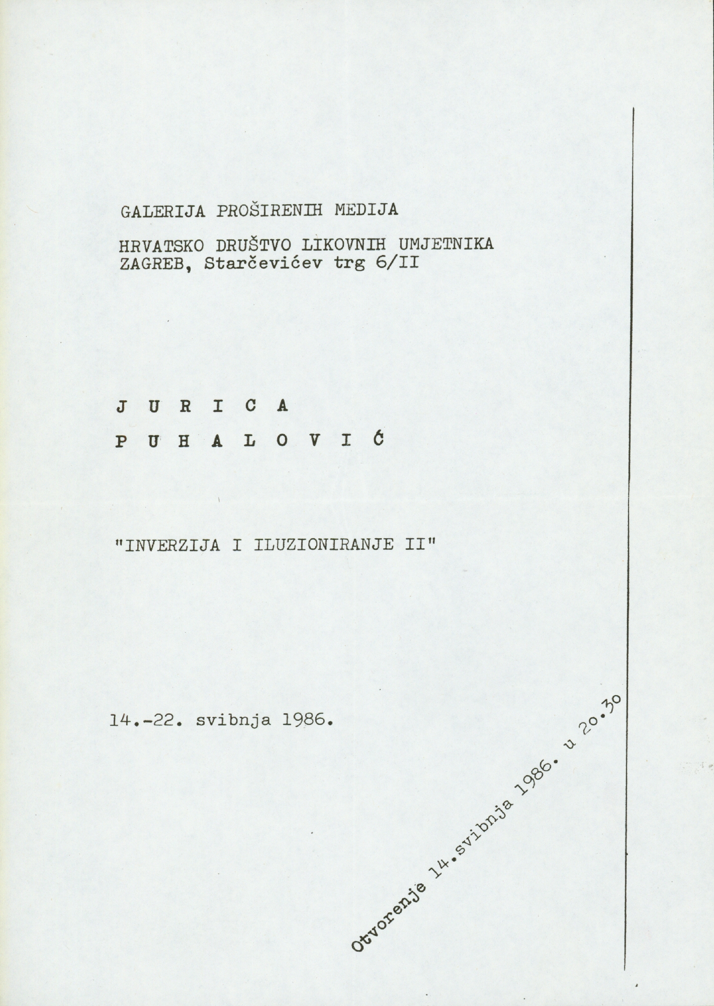 flyer of the exhibition "Inverzija i iluzioniranje II" of Jurica Puhalović in PM