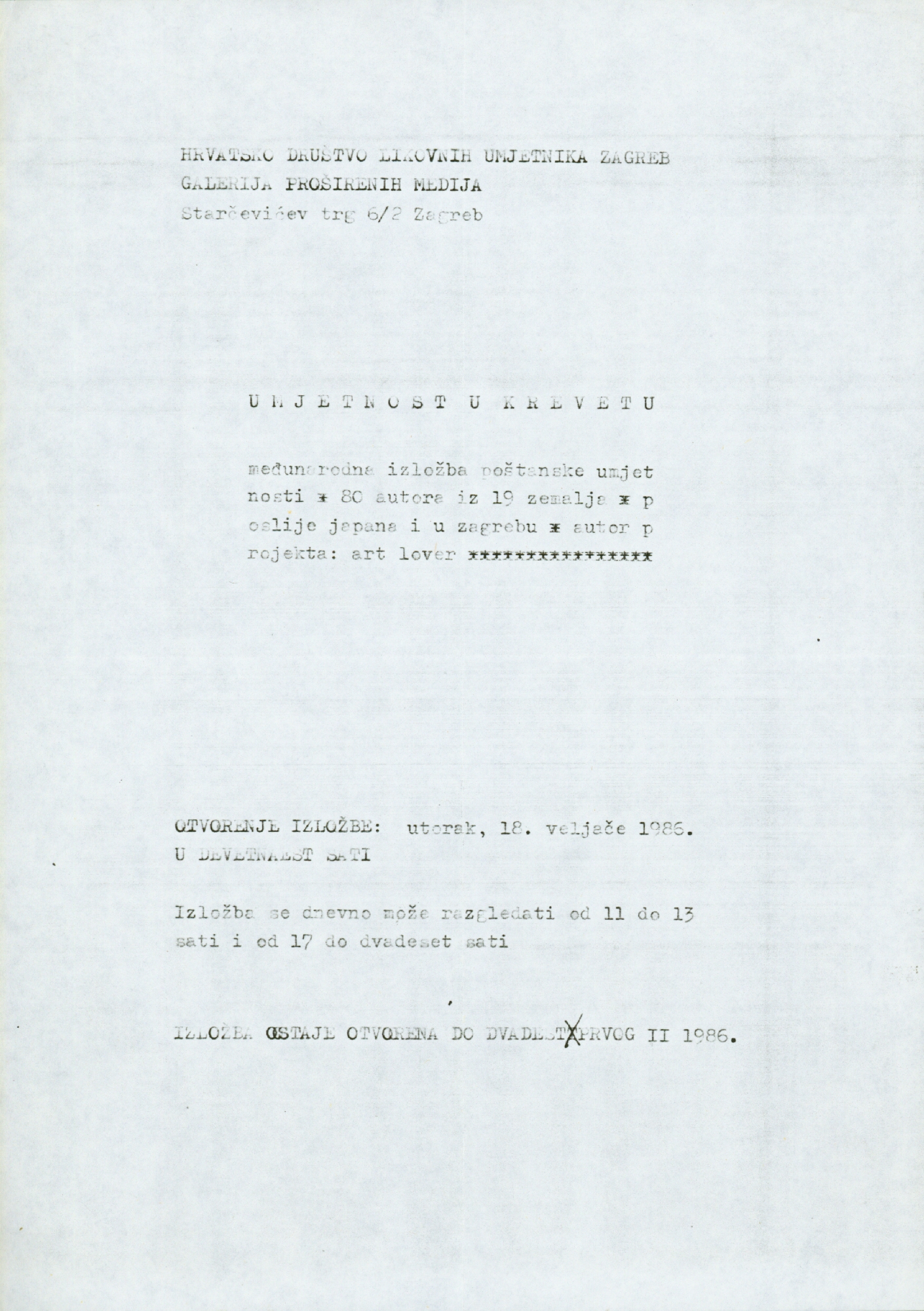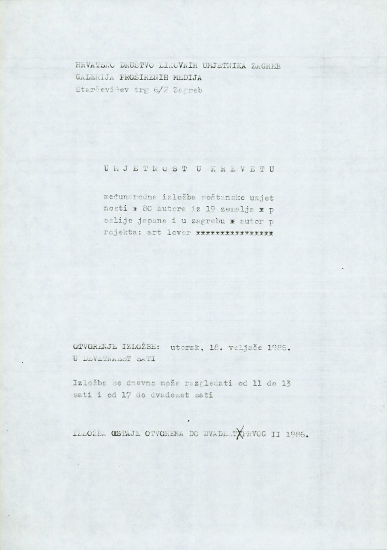 flyer of the exhibition "Umjetnost u krevetu" in PM; conception of Balit Szombathy