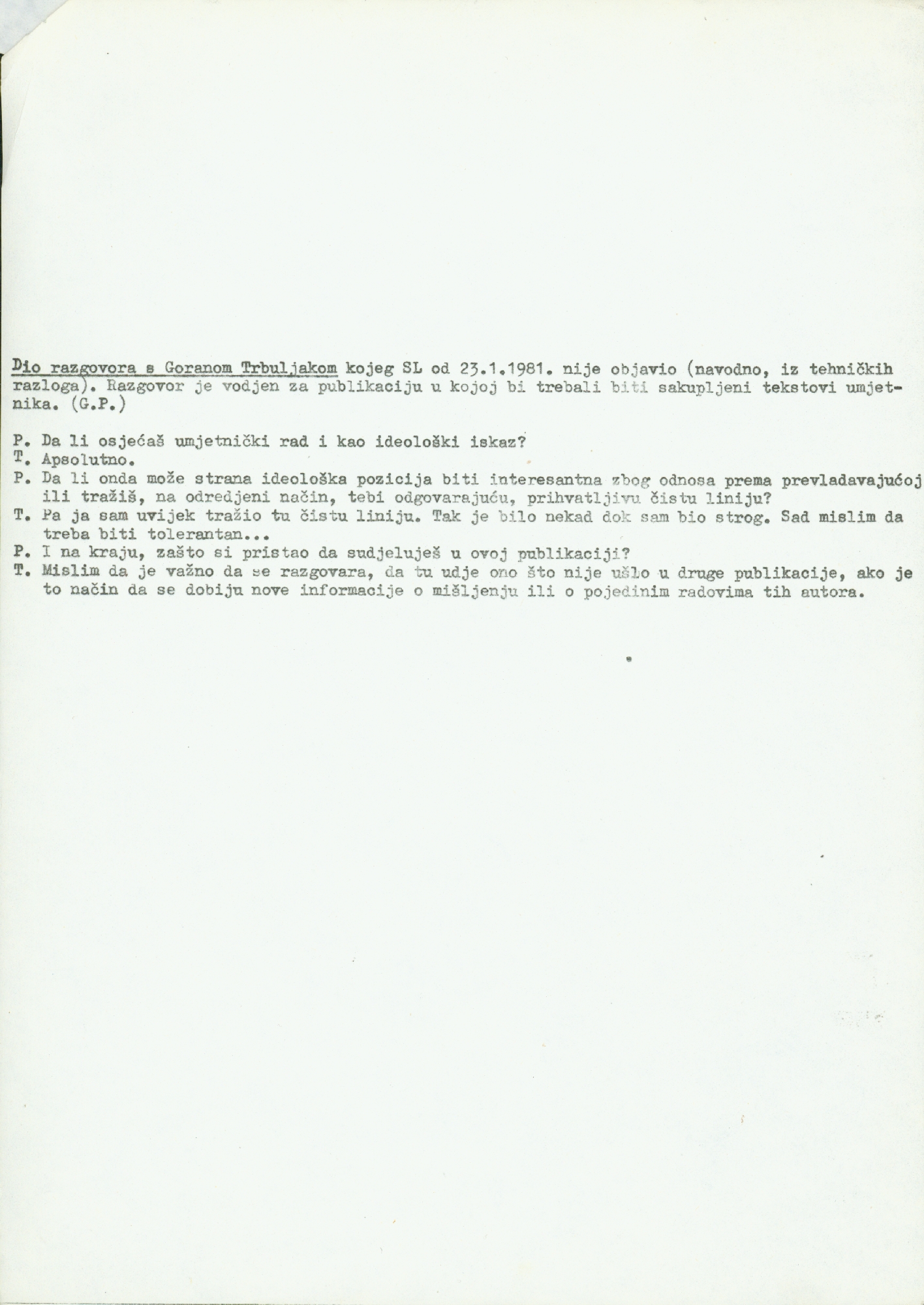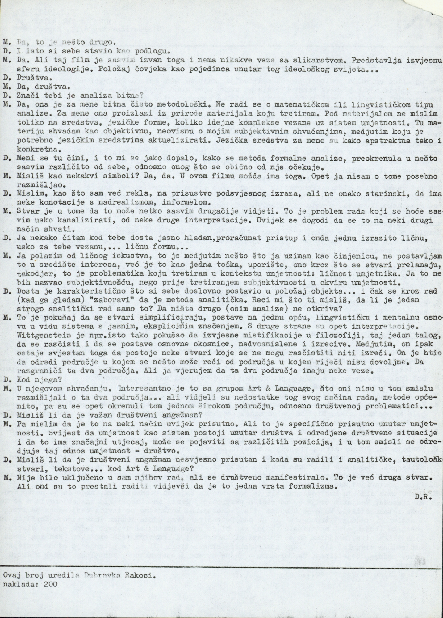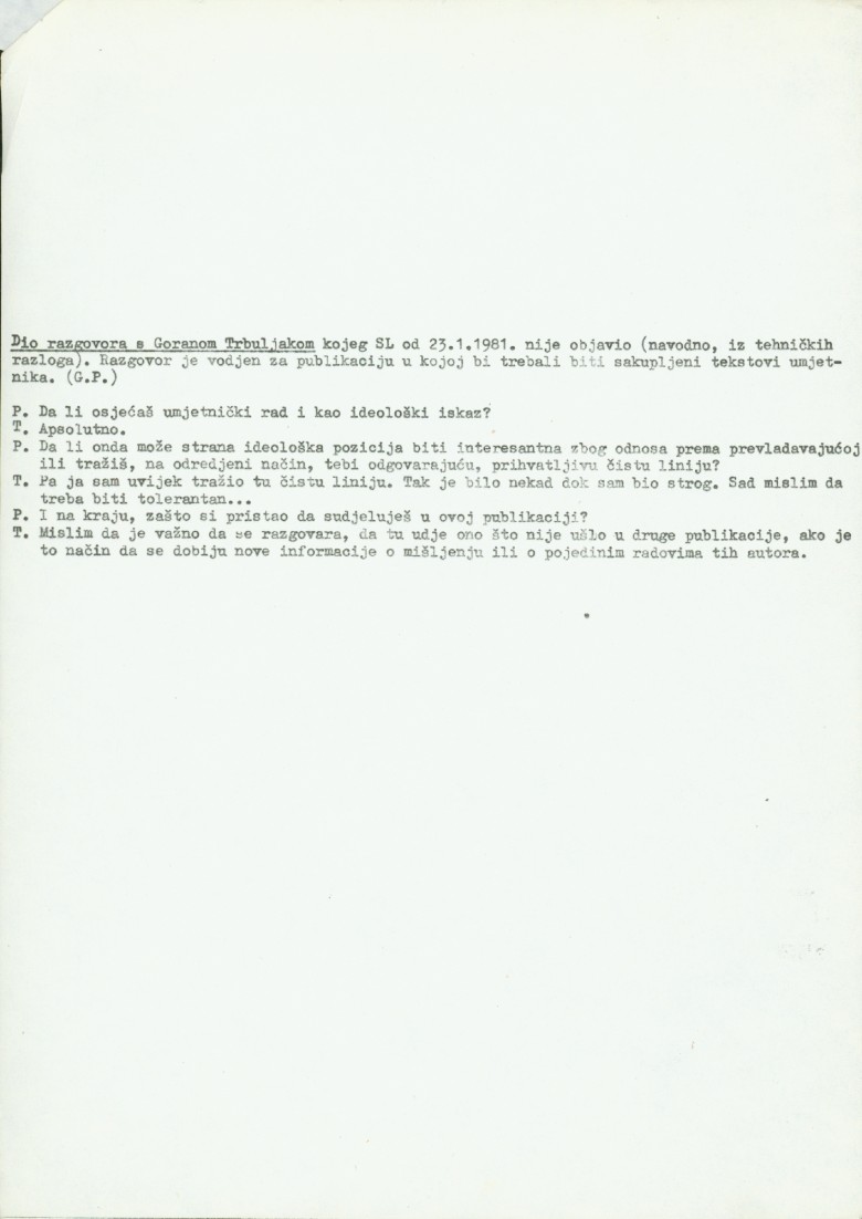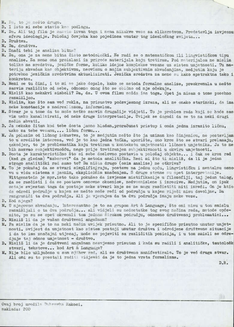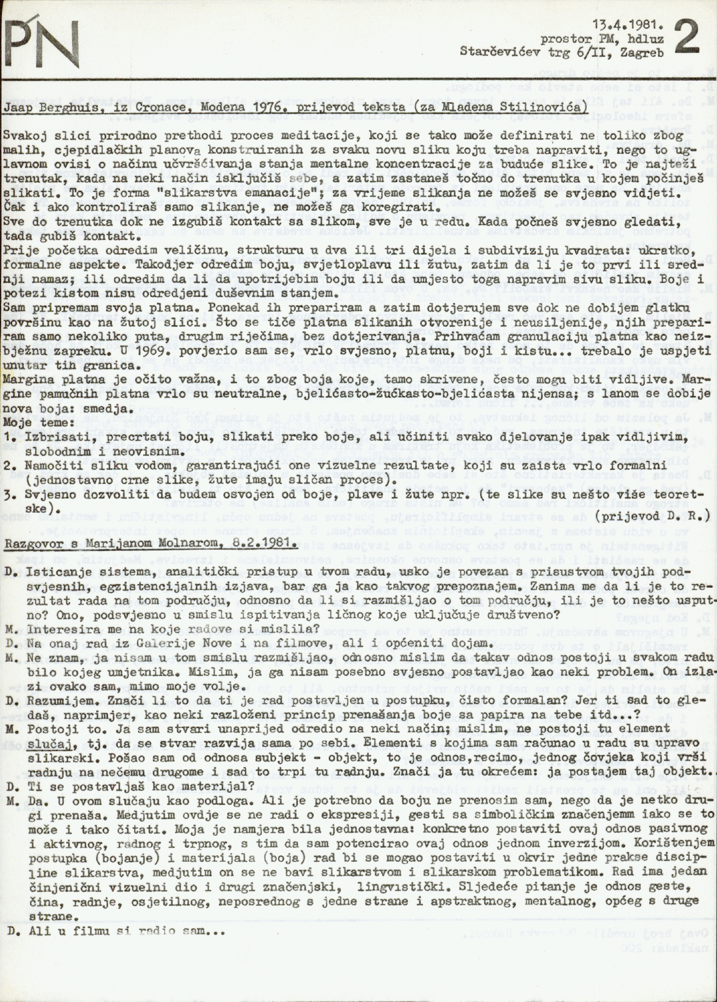 newspapers "Proširene novine" (PN), number 2, by prostor PM. HDLUZ, Stačevićev trg 6/II, Zagreb; interview with Marijan Molnar by Dubravka Rakoci; text by Jaap Berghuis (Cronaca, Modena, 1976. translation by Mladen Stilinović); a part of interview with Goran Trbuljak