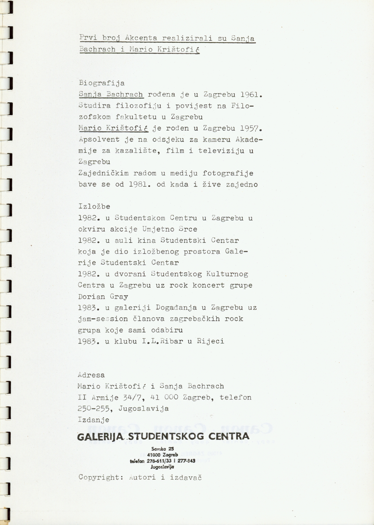 Akcent, number 1, publisher: Student Centre Gallery, Savska 23, 41000 Zagreb; Publication realised by Sanja Bachrach and Mario Krištofić