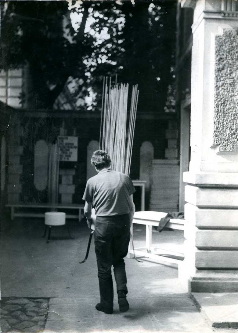 Włodzimierz Borowski ze swoją pracą "Zbiór stojakowy, 1968"