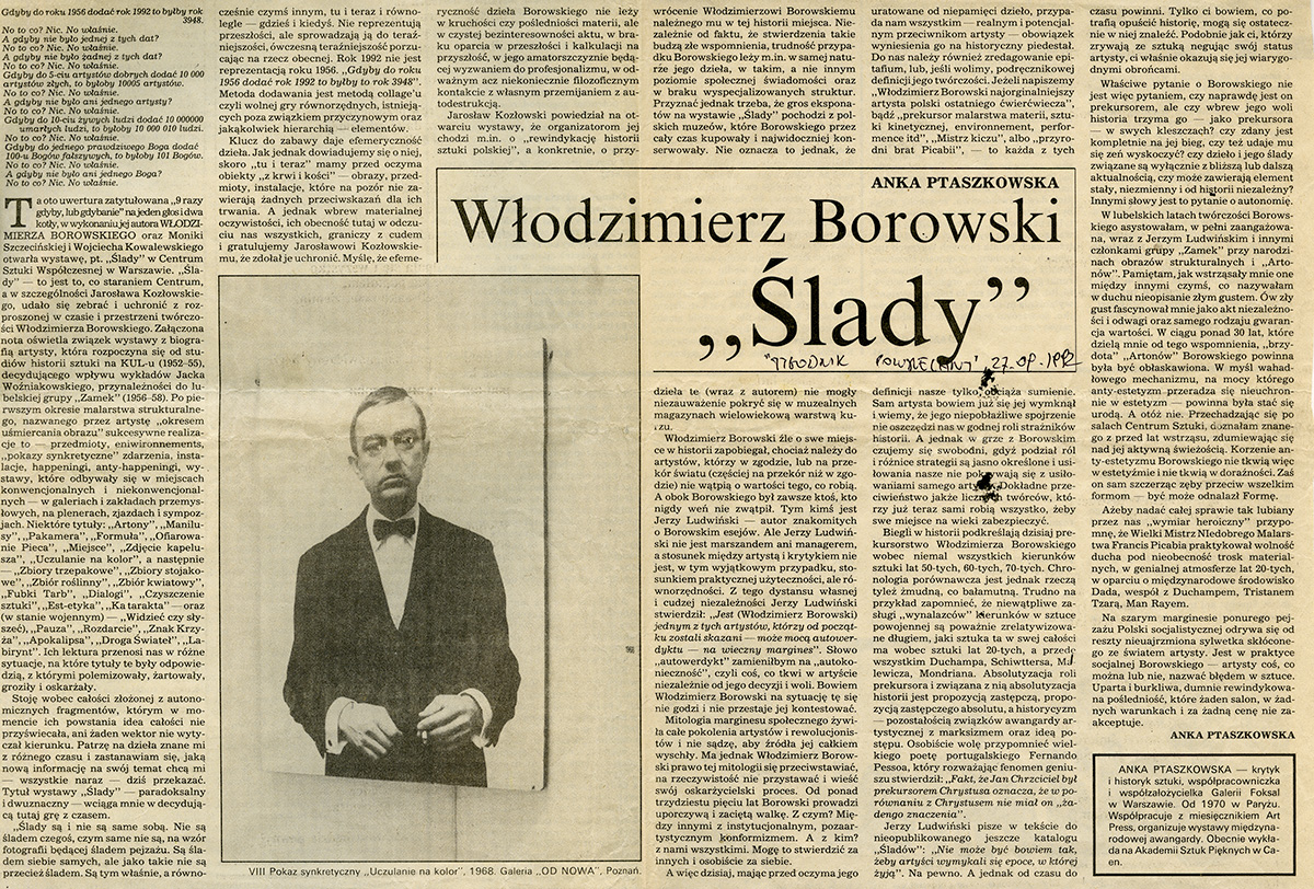 Artykuł Anki Ptaszkowskiej dotyczący wystawy Włodzimierza Borowskiego pt. Ślady w Centrum Sztuki Współczesnej w Warszawie; publikacja: „Tygodnik Powszechny” 27.09.1992