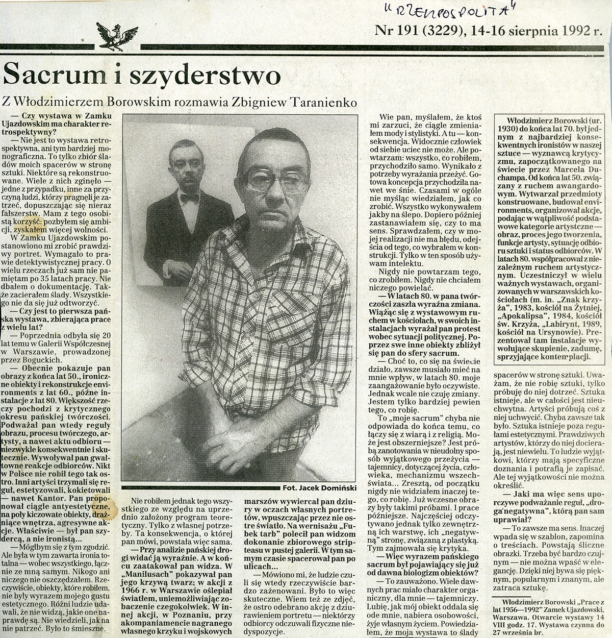 Wywiad Zbigniewa Taranienko z Włodzimierzem Borowskim pt. Sacrum i szyderstwo; „Rzeczpospolita” nr 191 (3229), 14-16.08.1992