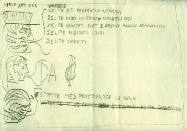 Osnutek na treh listih je osnutek priprave za objavo v Tribuni, 18.5. 66, XVI, št. 25, kot STRIP.ART.ENA.