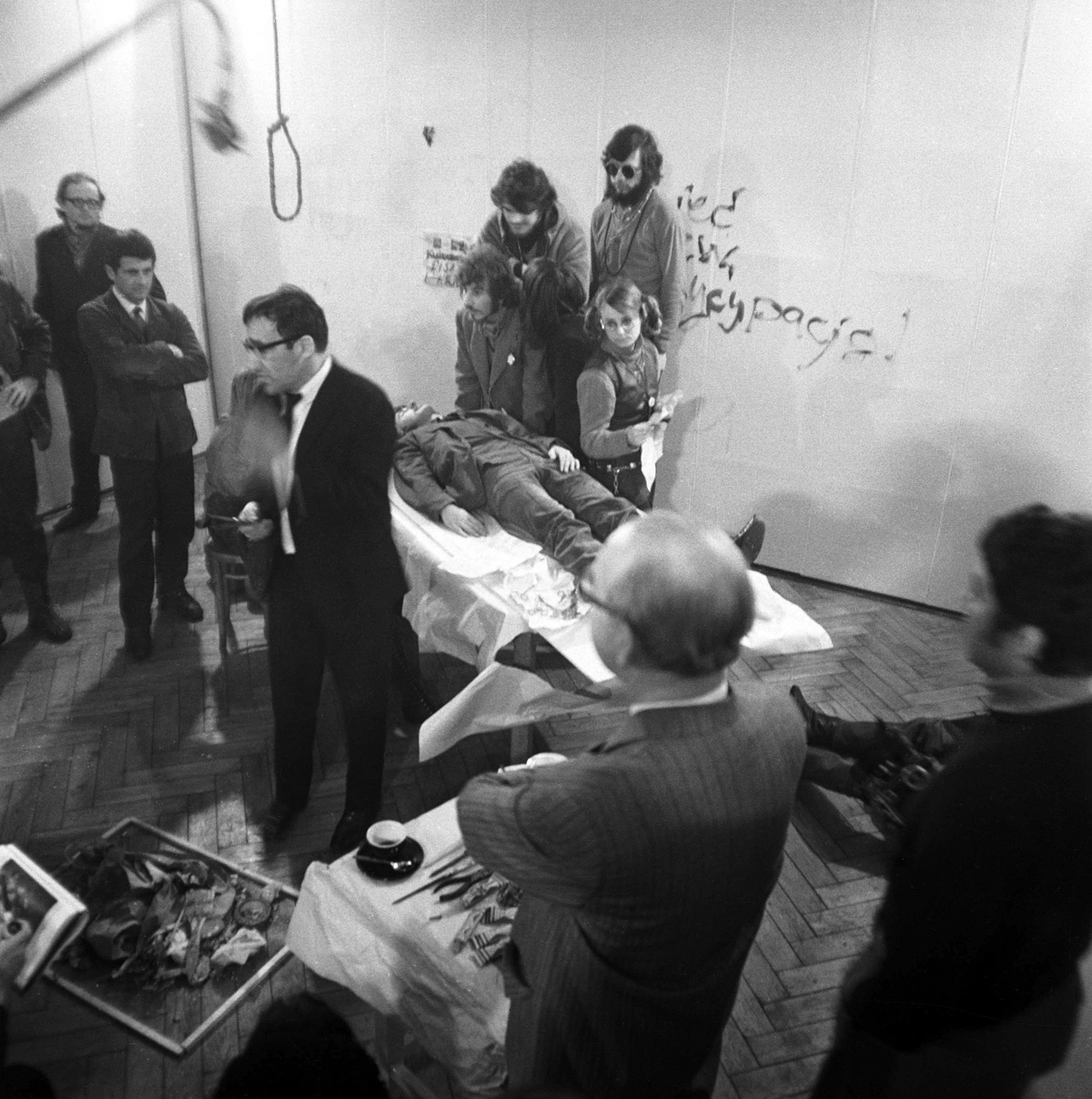 Eustachy Kossakowski's photographs of Tadeusz Kantor's happening "Rembrandt's Anatomy Lesson" at the Foksal Gallery, Warsaw, 1969