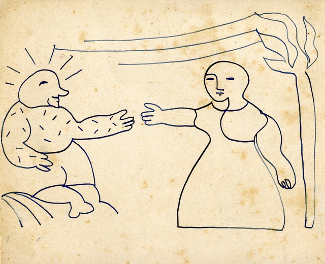 Delo datira v čas predohojevske faze, tudi v čas t. i. neformalne kranjske skupine. Marko Pogačnik je v času nastanka obiskoval gimnazijo v Kranju. Risbe, ki so nastajale v tem času, je podpisoval s psevdonimom Toska, po liku, ki ga je odigral v dijaški predstavi. Na sliki je predstavljen motiv starozaveznega očaka Joba, naslikan po vzoru panjskih končnic. Job sedi na kupu gnoja, na njegovem telesu so sledi nadlog, s katerimi je bil preizkušan. Nasproti njega stoji dekle in mu ponuja roko, vendar se dotik med njima še ni zgodil. Pogačnik je po pripovedovanju v Jobovi figuri naslikal samega sebe, kot osebo, ki še vedno upa na ljubezensko naklonjenost dekleta, s katero sta bila sošolca. Kot poklon tej temi in dekletu je na zadnjo stran risbe prilepil papir s pisavo dekleta. Na listu je z nalivnim peresom izpisano ime in naslov pisatelja, ki je bil del obveznega šolskega branja. List s pisavo ljubljene je shranil in mu namenil posebno mesto. Zanimiv je tudi sam način risbe, ki ustreza poznejši reistični risbi in še poznejši avtorjevi potezi na risbah geomantičnih pojavov. To je linijska risba, ki skuša neprekinjeno, v eni potezi izrisati želeno.