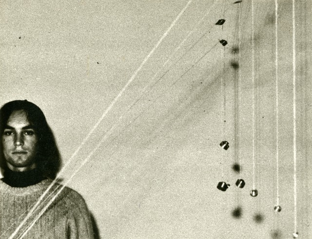 Z razstave v Galeriji Doma omladine, Beograd, november - december 1969? Različni položaji britvic, prek katerih teče vrvica, so odvisni od teže obešenih uteži.