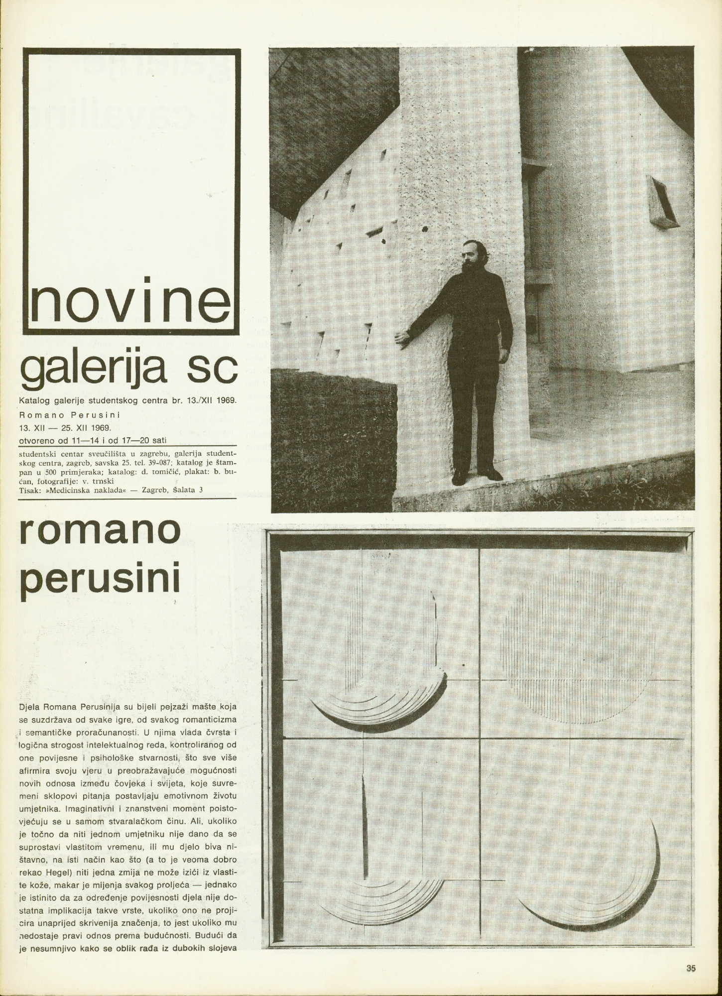 Studenstki centar Sveučilištau Zagrebu, Galerija Studentskog centra, Zagreb, Savska 25; Plakat B. Bućan, Katalog D. Tomičić; fotografije V. Trnski; katalog štampan u 500 primjeraka; tisak: Medicinska naklada, Zagreb, Šalata 3; Romano Perusini, Silvio branzi, about gallery Cavallino