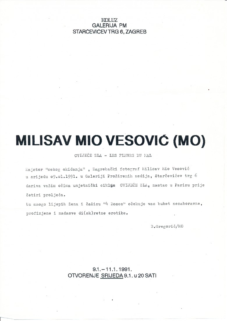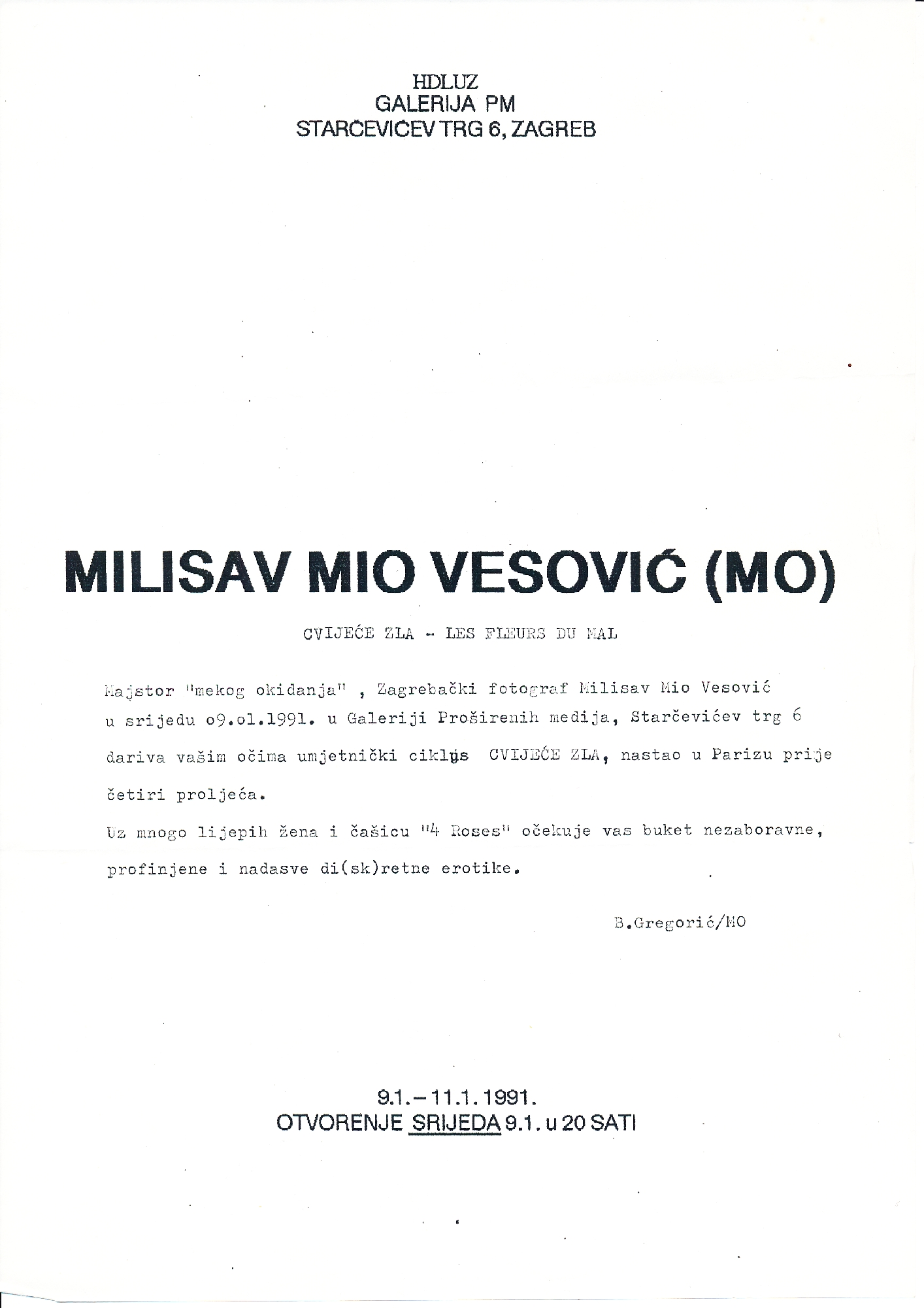 letak izložbe "Cvijeće zla - Les fleurs du mal" Mije Vesovića u Galeriji Proširenih medija, tekst: B.Gregorić