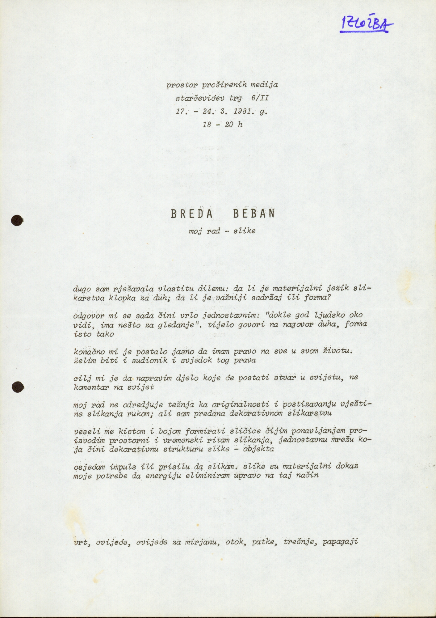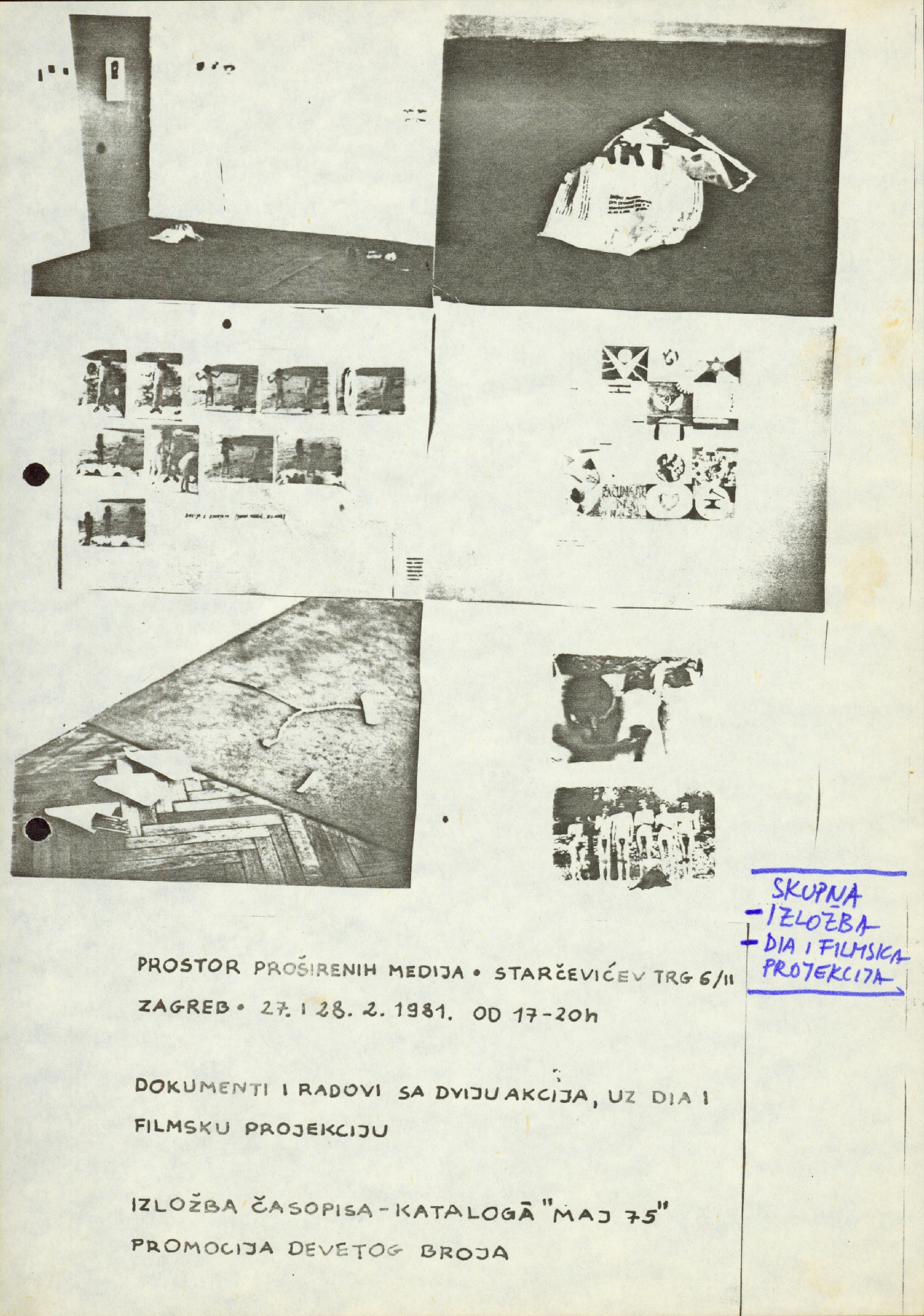 informacija o izložbi "Dokumenti i radovi sa dviju akcija, uz dia i filmsku projekciju" i izložba kataloga "Maj 75" u PM