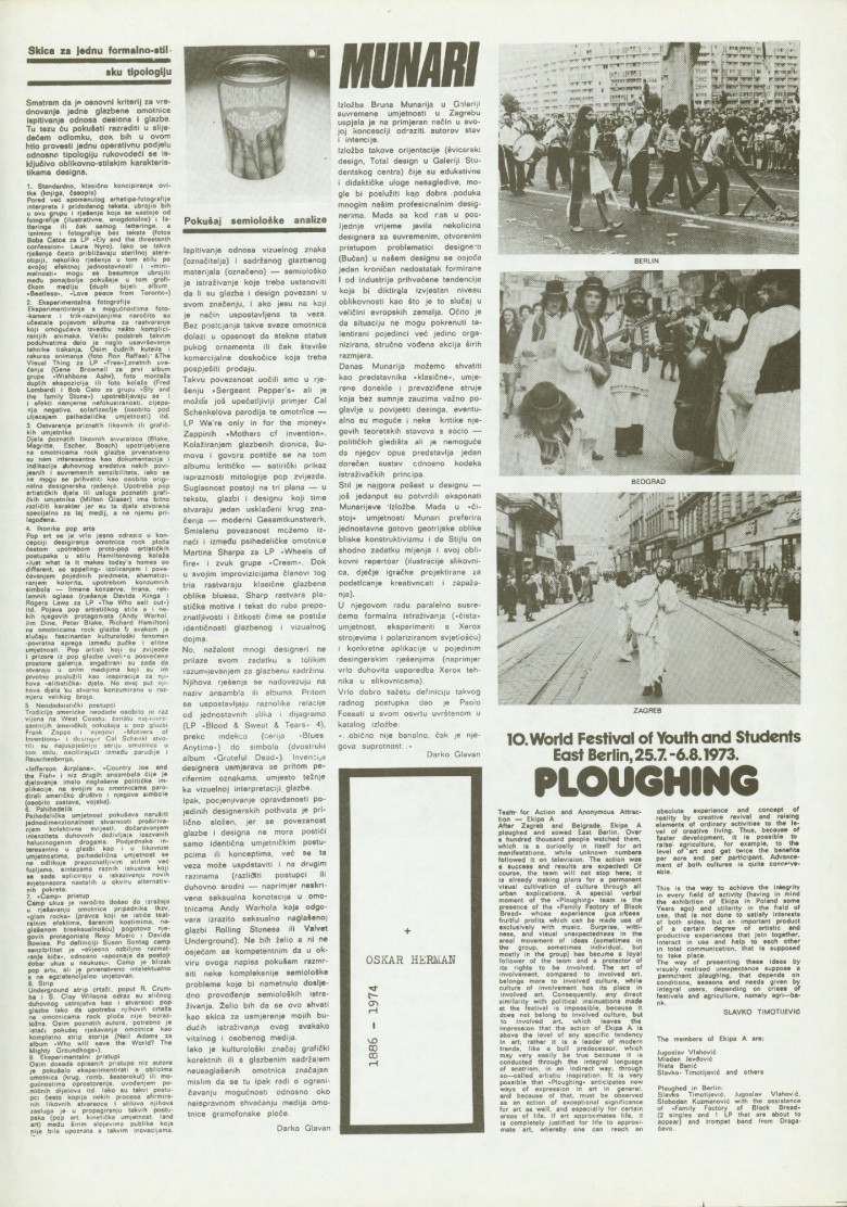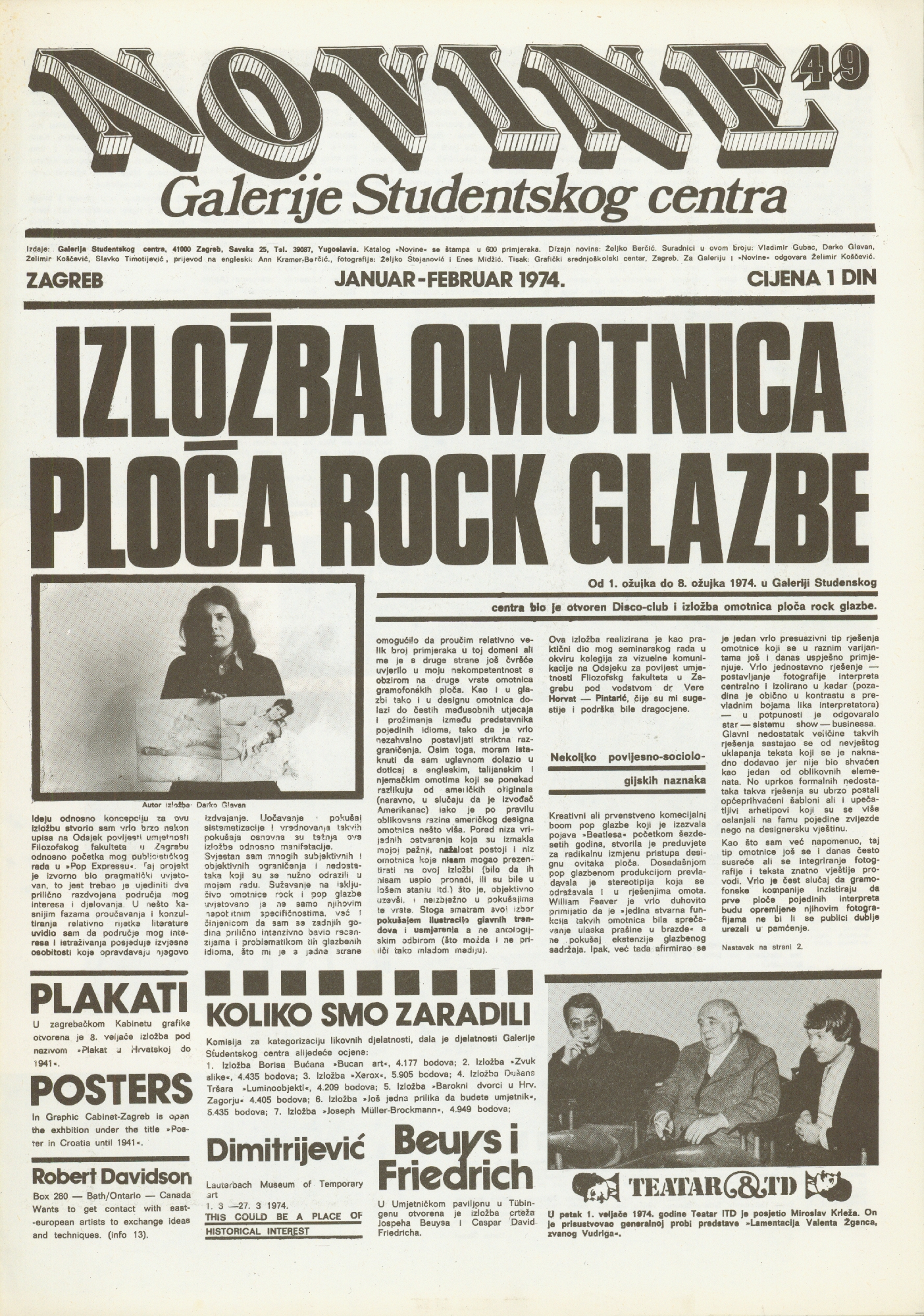 cijena 1 dinar; Novine izdaje: Galerija Studentskog centra, Zagreb, Savska 25, Studentski centar Sveučilišta u Zagrebu; dizajn novina: Željko Borčić; Fotografije: Željko Stojanović i Enes Midžić; novine su tiskane u 600 primjeraka; tisak: Grafički srednjoškolski centar, Zagreb; za novine i galeriju odgovara: Želimir Koščević; suradnici: Vladimir Gudac, Darko Glavan, Želimir Koščević, Slavko Timotijević, prijevod na engleski: Ann Kramer-Borčić; Braco Dimitrijević, Beuys, Miroslav Krleža, Robert Davidson, Bruno Munari, Oskar Herman, Jan Dibbets, Viktor Papanek, Daniel Buren