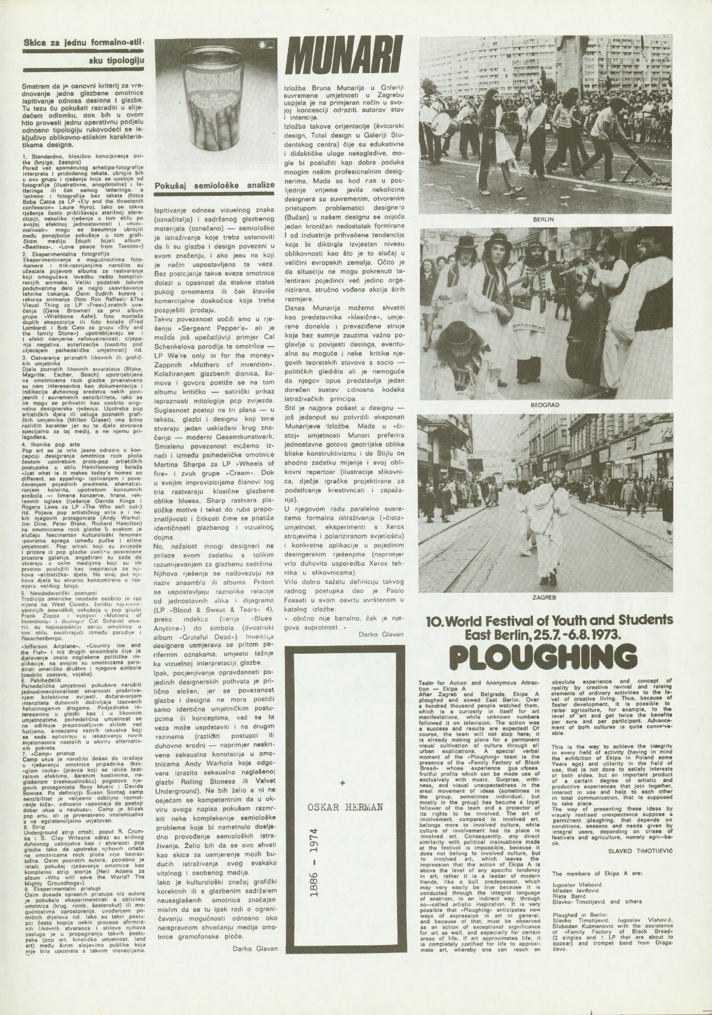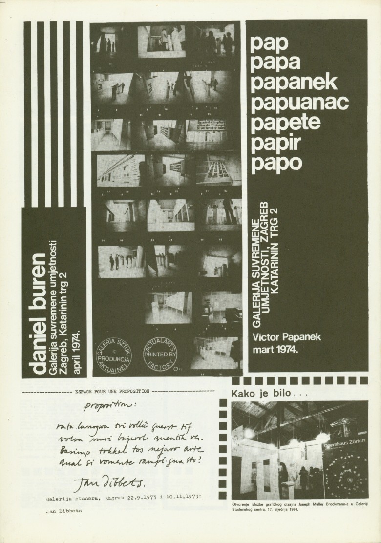 Željko Borčić, Željko Stojanović, Enes Midžić, Želimir Koščević, Vladimir Gudac, Darko Glavan, Slavko Timotijević, Ann Kramer-Borčić; Braco Dimitrijević, Beuys, Miroslav Krleža, Robert Davidson, Bruno Munari, Oskar Herman, Jan Dibbets, Viktor Papanek, Daniel Buren